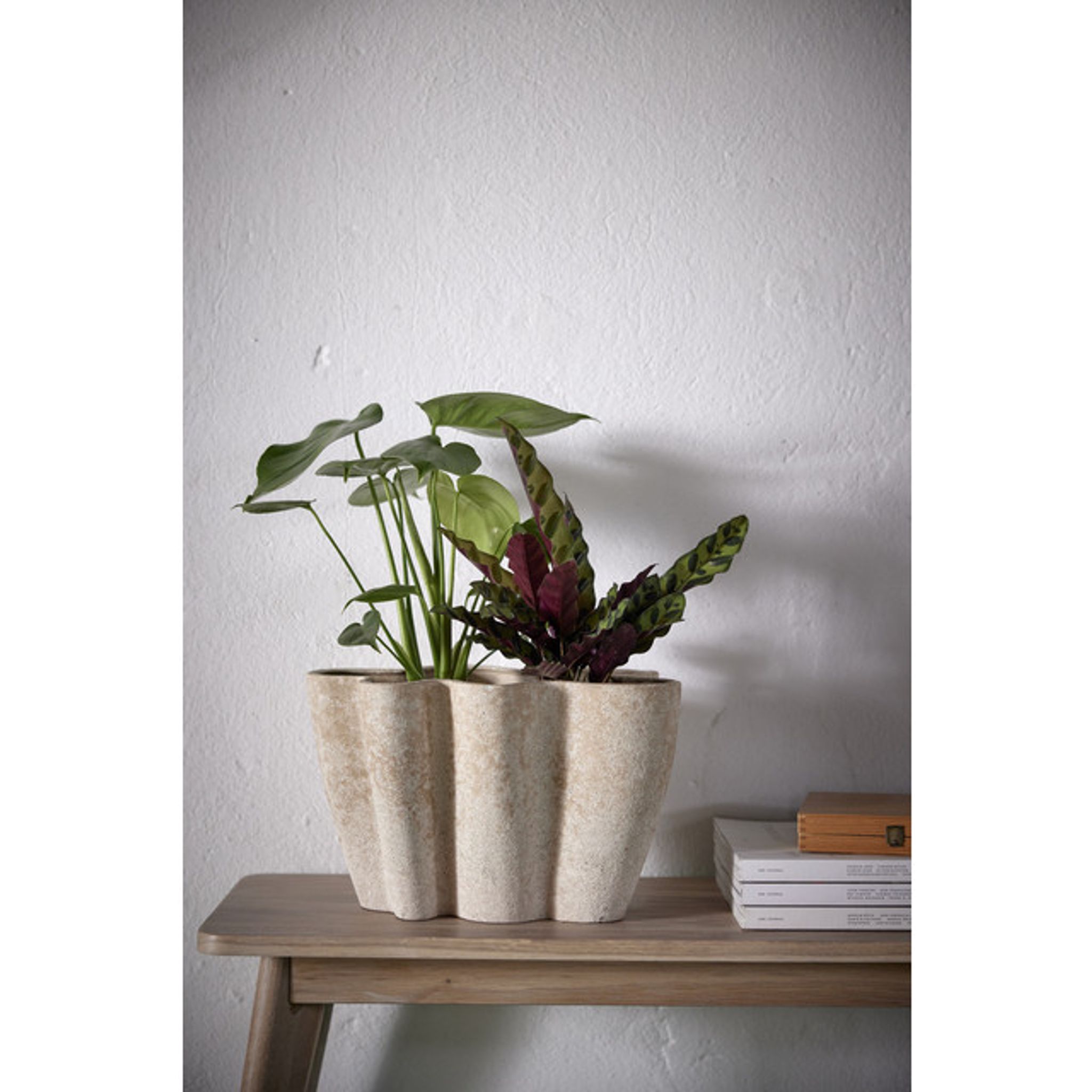 Som blomkruka bidrar den till en mer ombonad känsla och gör det enklare för dig att skapa ett avskalat stilleben eller ge växterna en tydlig plats i rummet.