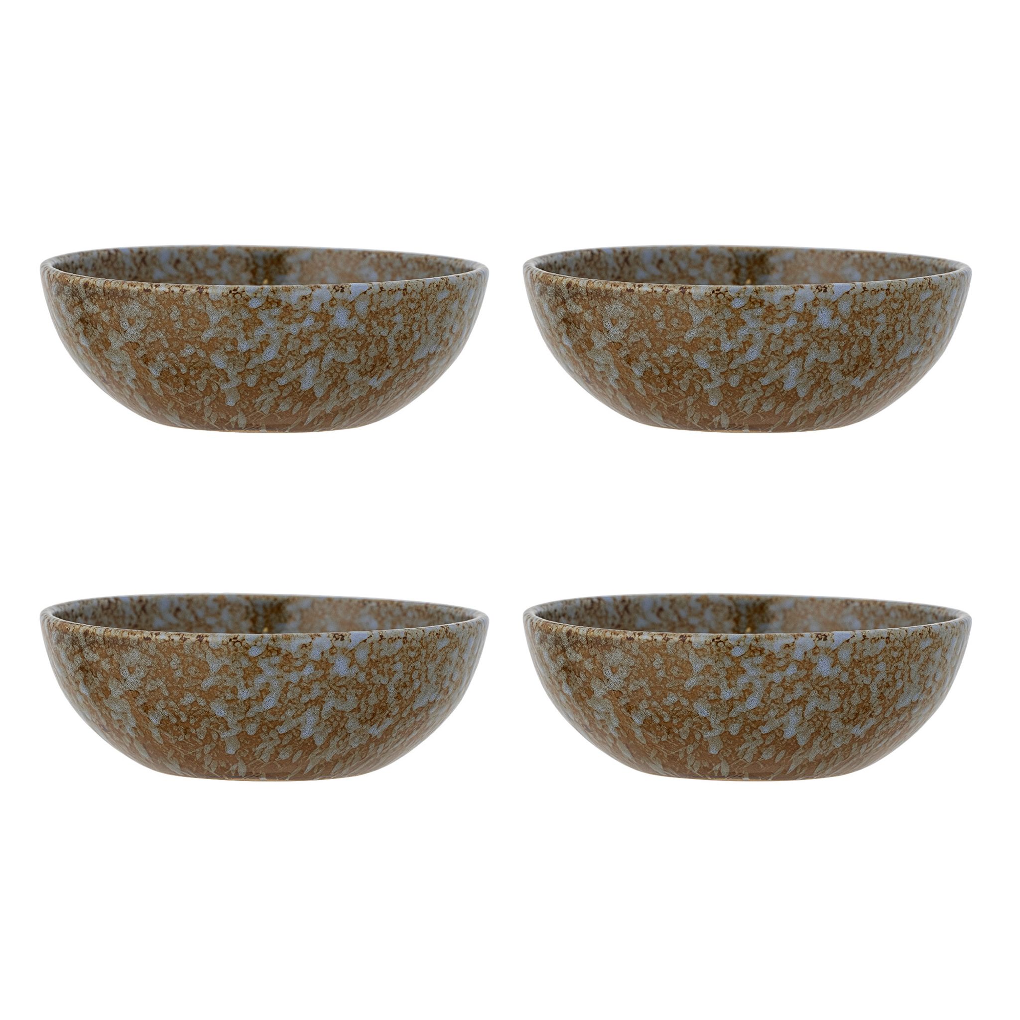 Upptäck Bloomingville Paula Skålset, med fyra stengodsskålar i bruna och blå nyanser som ger en stilfull touch till ditt bord.
