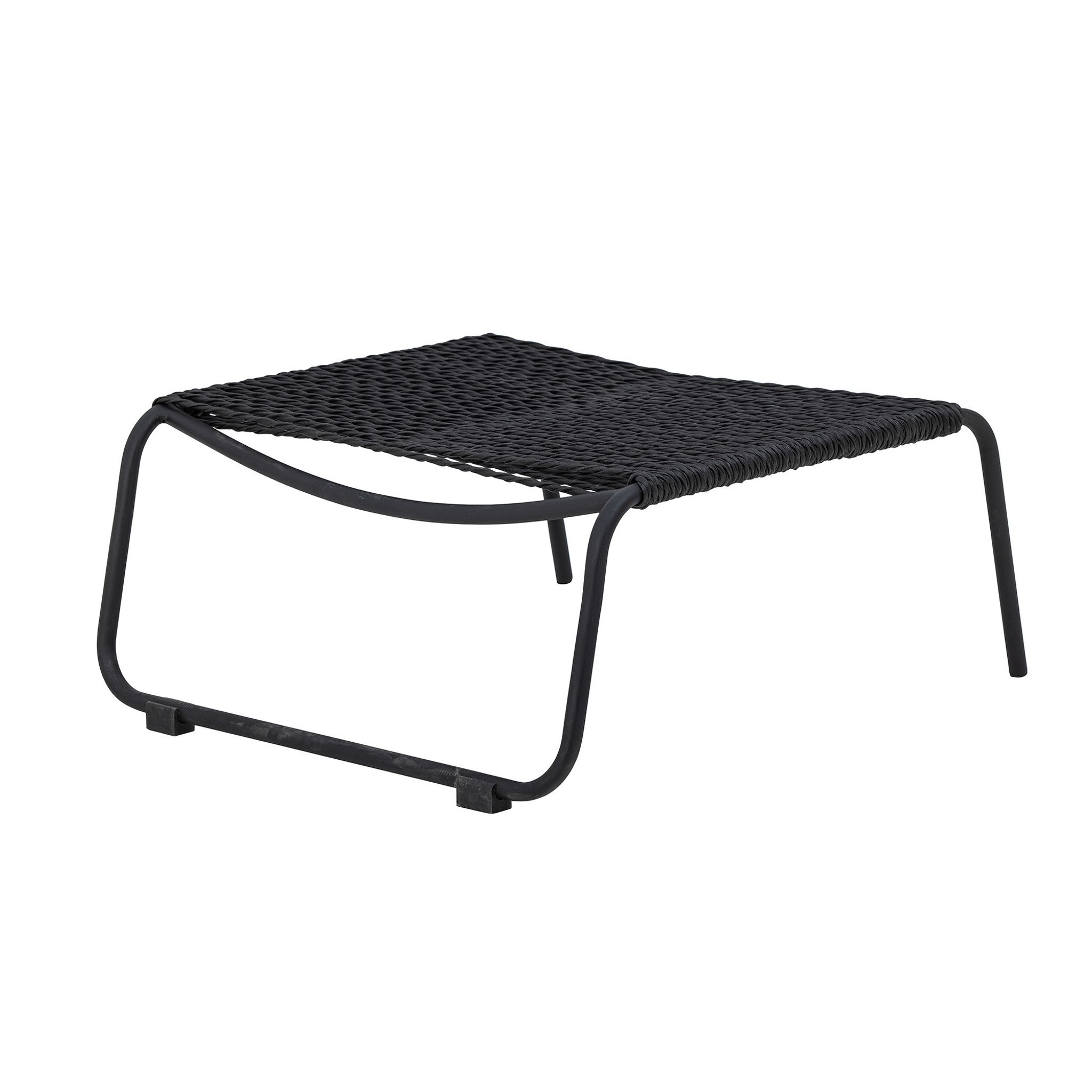 En solstol med pall i svart metall för din trädgård, uteplats eller terrass. Setet har en flätad snoddkonstruktion och medföljande kudde och fotpall — en enkel lösning när du vill koppla av ute i solen.