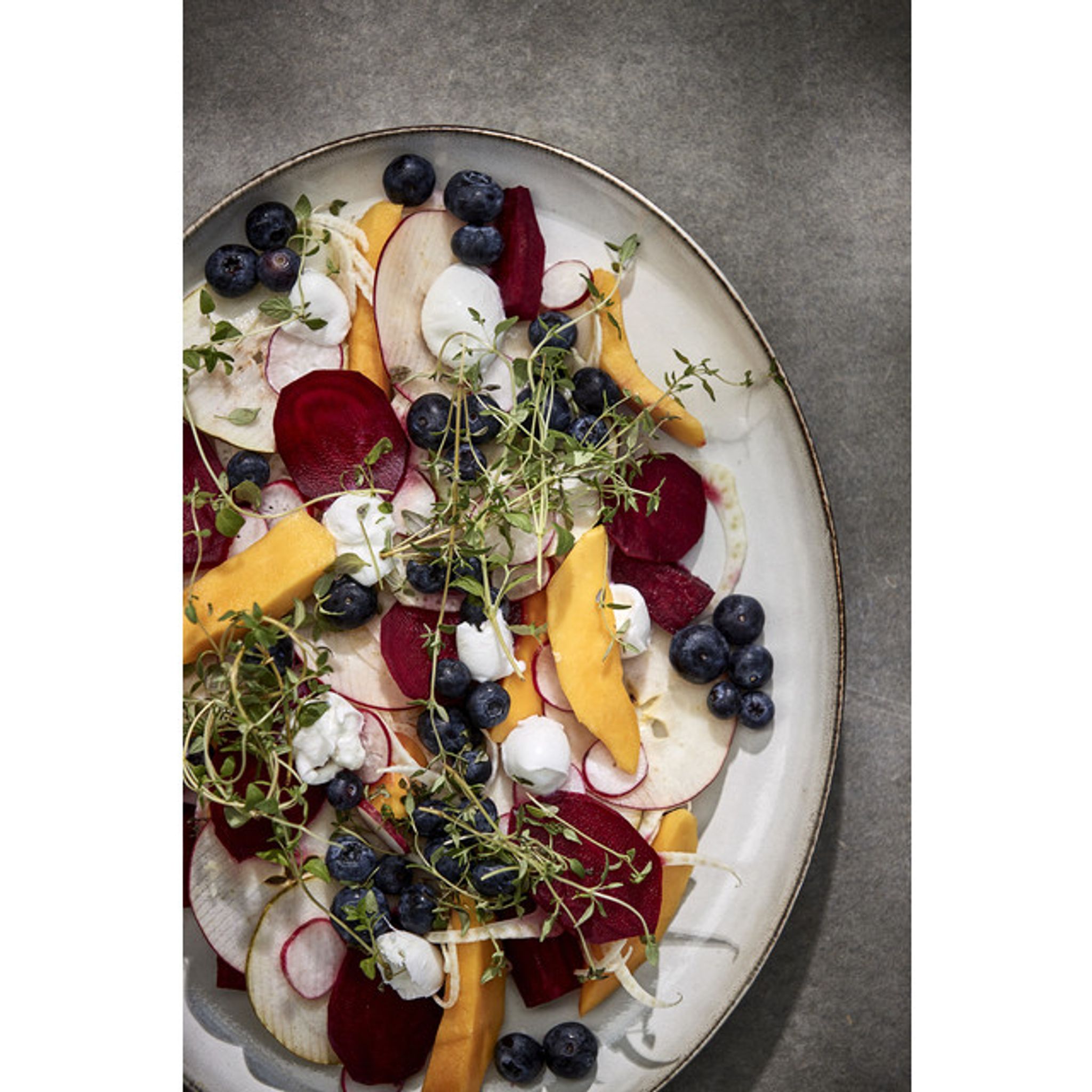 Amera-brickan kombinerar funktion och form: den är utformad för att du ska kunna presentera mat och tillbehör på ett välgjort sätt samtidigt som den bidrar till din hemdekoration. Den reaktiva glasyren ger varje bricka ett personligt uttryck, vilket gör den användbar både till vardaglig servering och vid speciella tillfällen.