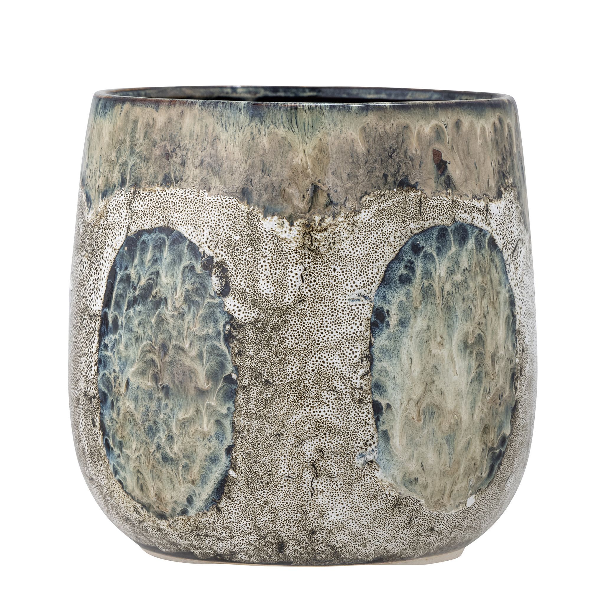 Det här är en handgjord blå blomkruka från Bloomingville i stengods — en dekorativ kruka som passar i vardagsrum, på hyllan, bordet eller på kontoret. Den abstrakta blå/grå ytan ger inredningen ett konstnärligt inslag och lyfter dina växter.