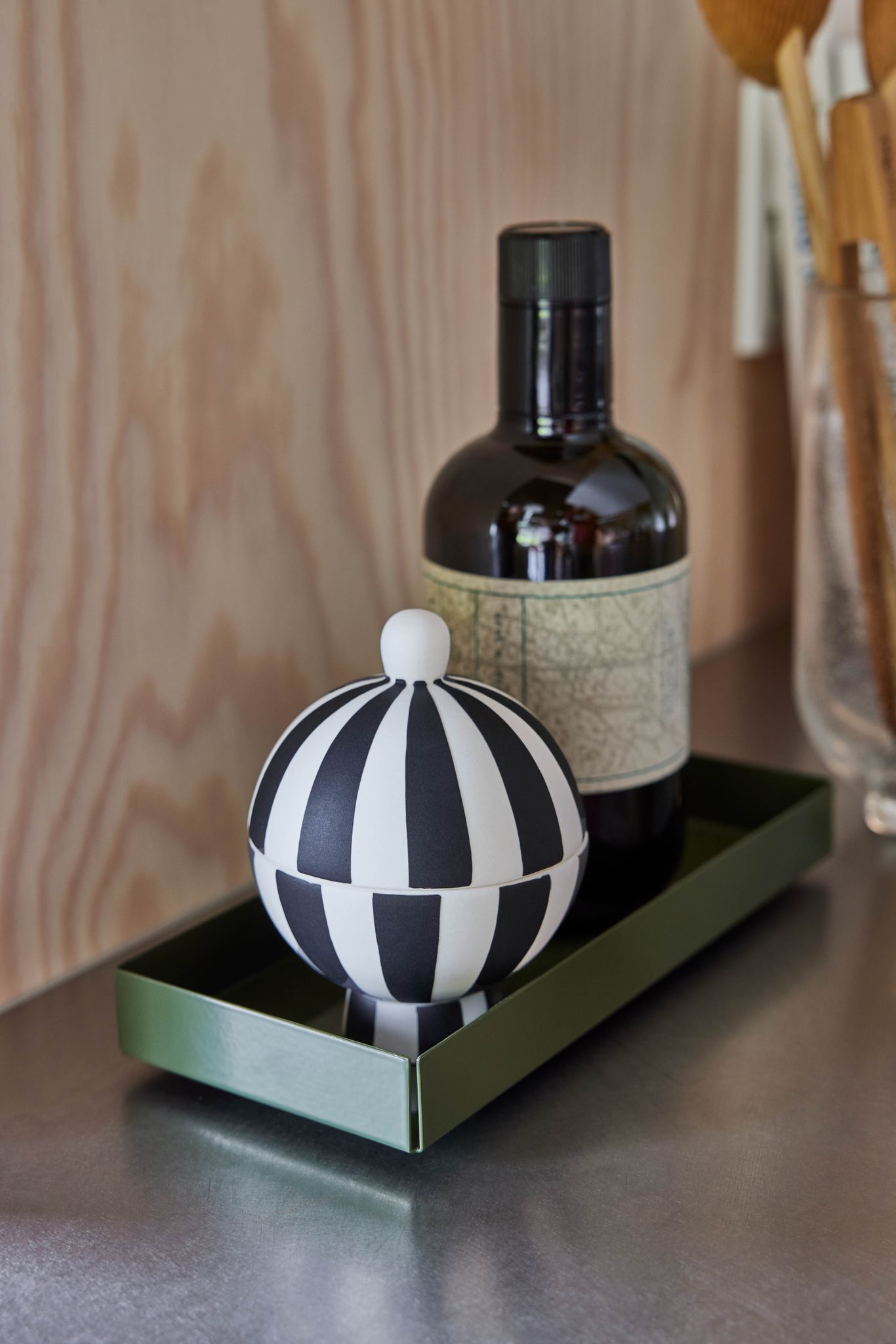 Brickan kombinerar robust stålbyggnad med en genomtänkt olivnyans som kompletterar olika inredningsstilar i kök och matrum. Den tål vardagligt bruk och gör det smidigare när du ska servera snacks, dryck eller samla ihop kryddor och småprylar.
