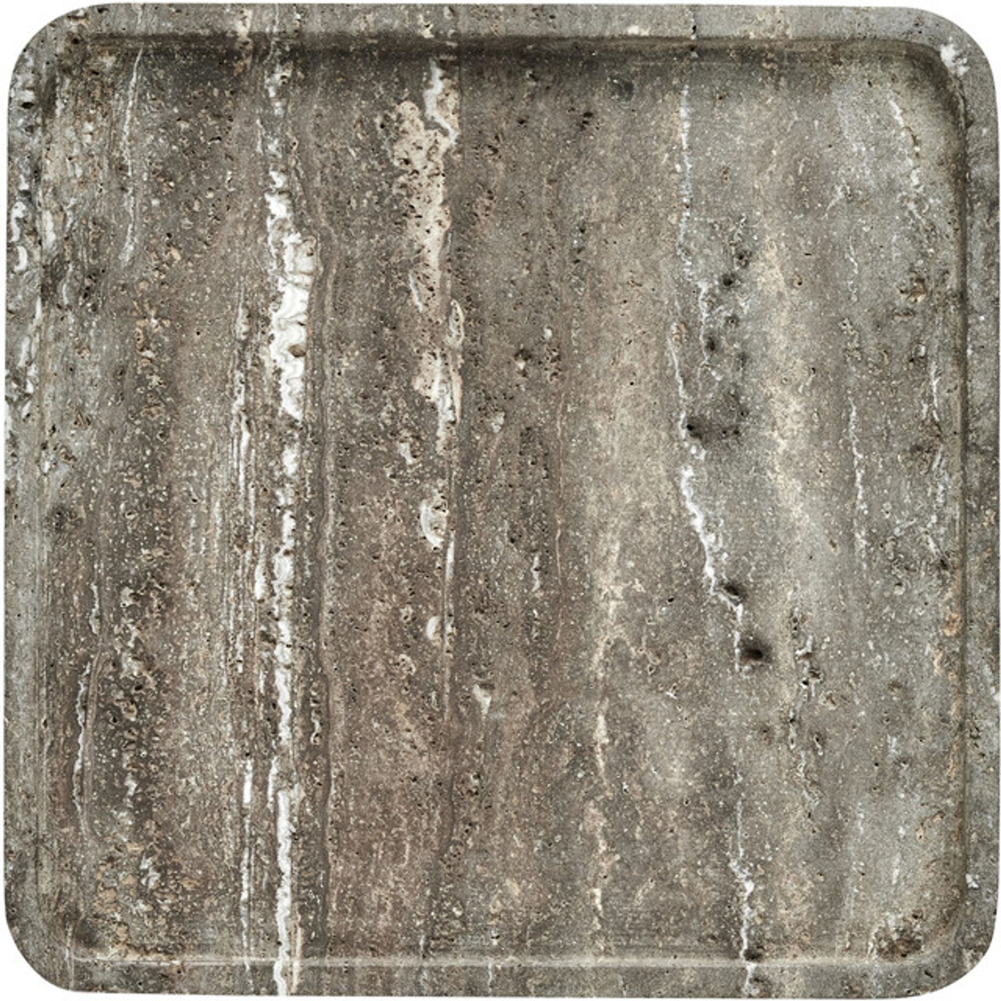 Brickan är tillverkad i travertin och har en varm brun ton med en slät yta och sval känsla. Måtten är L25 × B25 × H2 cm, en praktisk storlek för både dekoration och enklare servering.