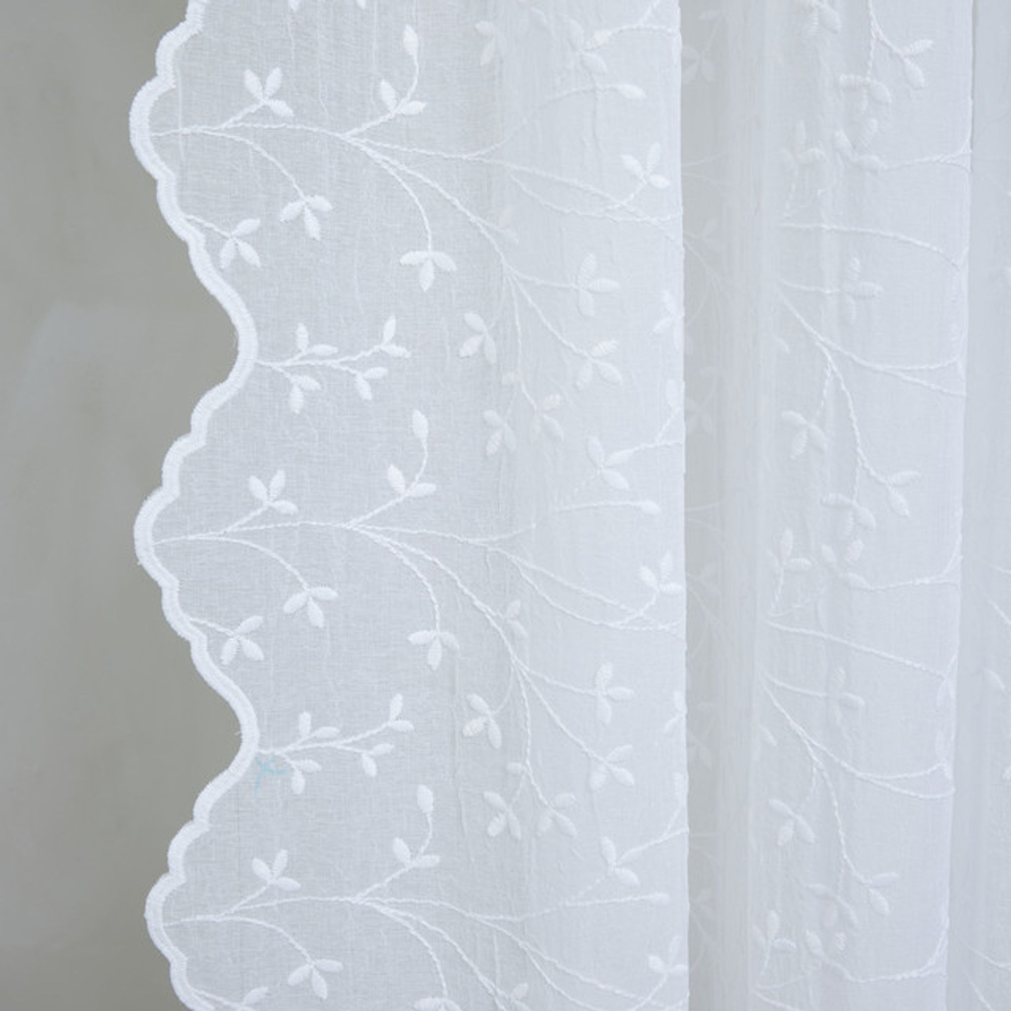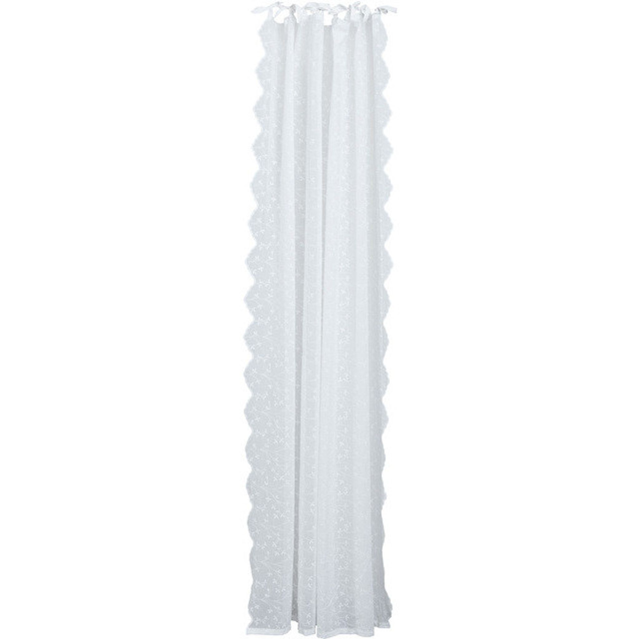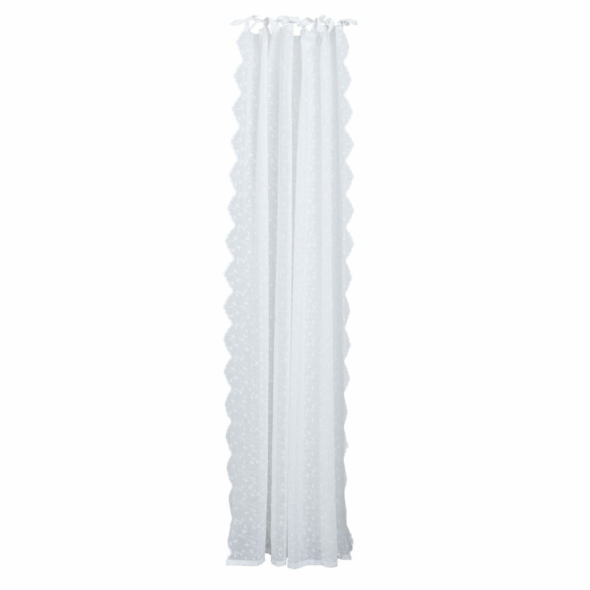 Eloise-gardinen från Lene Bjerre är en benvit gardin i polyester med broderi och vågiga scallops. Den passar väl i sovrum och vardagsrum eller vid fönster där du vill ha ett mjukt ljusinsläpp och mer insynsskydd utan att rummet blir mörkt.
