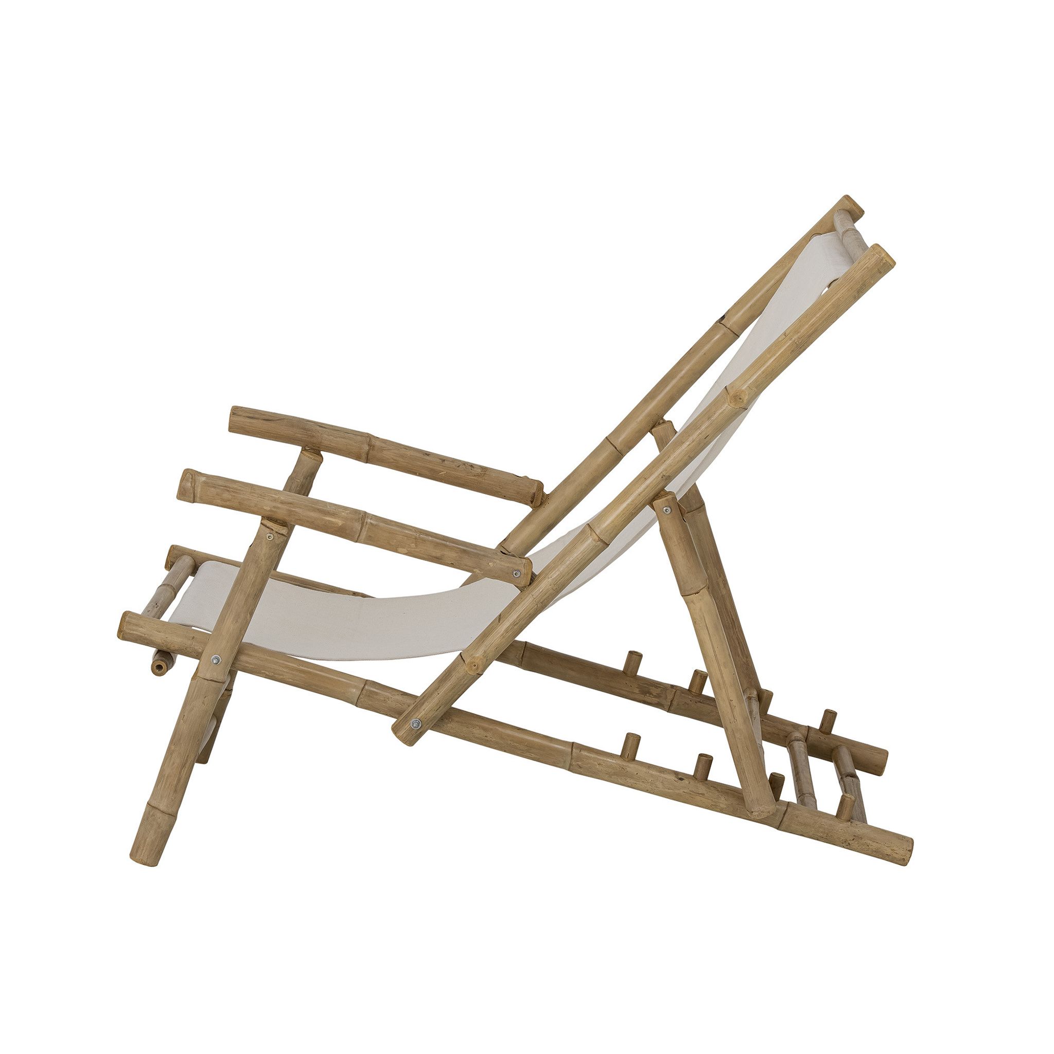 Korfu Solstol Natur Bambu från Bloomingville är en stilren utomhusstol i naturlackad bambu med slitstarkt tyg i bomull och polyester (färg Natur). Den kombinerar naturlig elegans med bekväm loungestol för balkong, veranda eller trädgård.