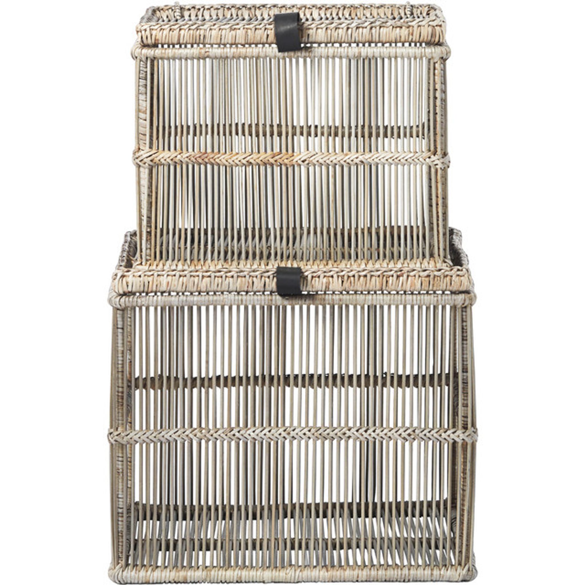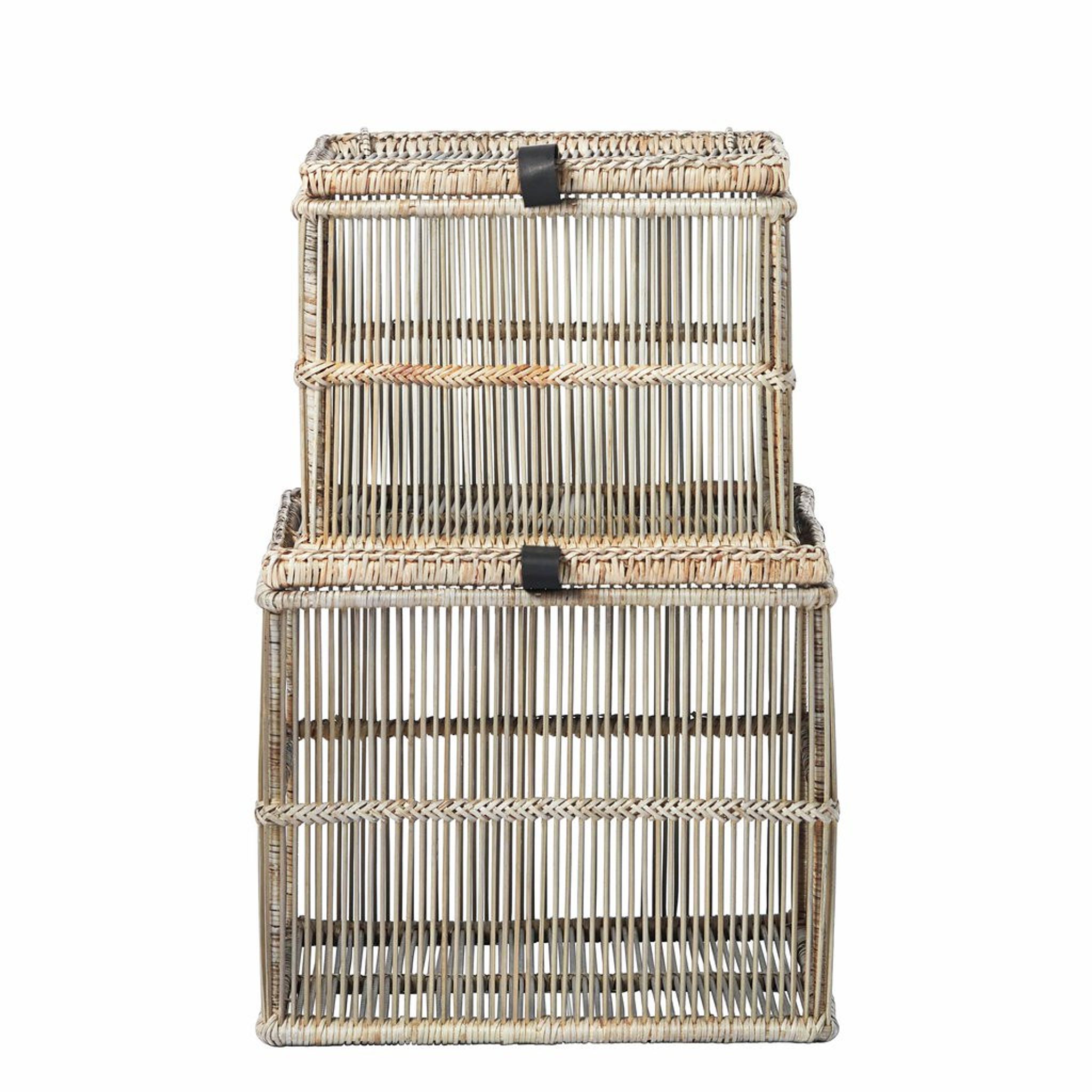 Det här är ett korgset i rotting från Lene Bjerre – två handflätade boxar (en liten och en stor) med lock. Korgarna passar bra i vardagsrum, sovrum, hall eller på hyllan när du vill ha ordning på filtar, leksaker eller småprylar samtidigt som det ser ombonat ut.