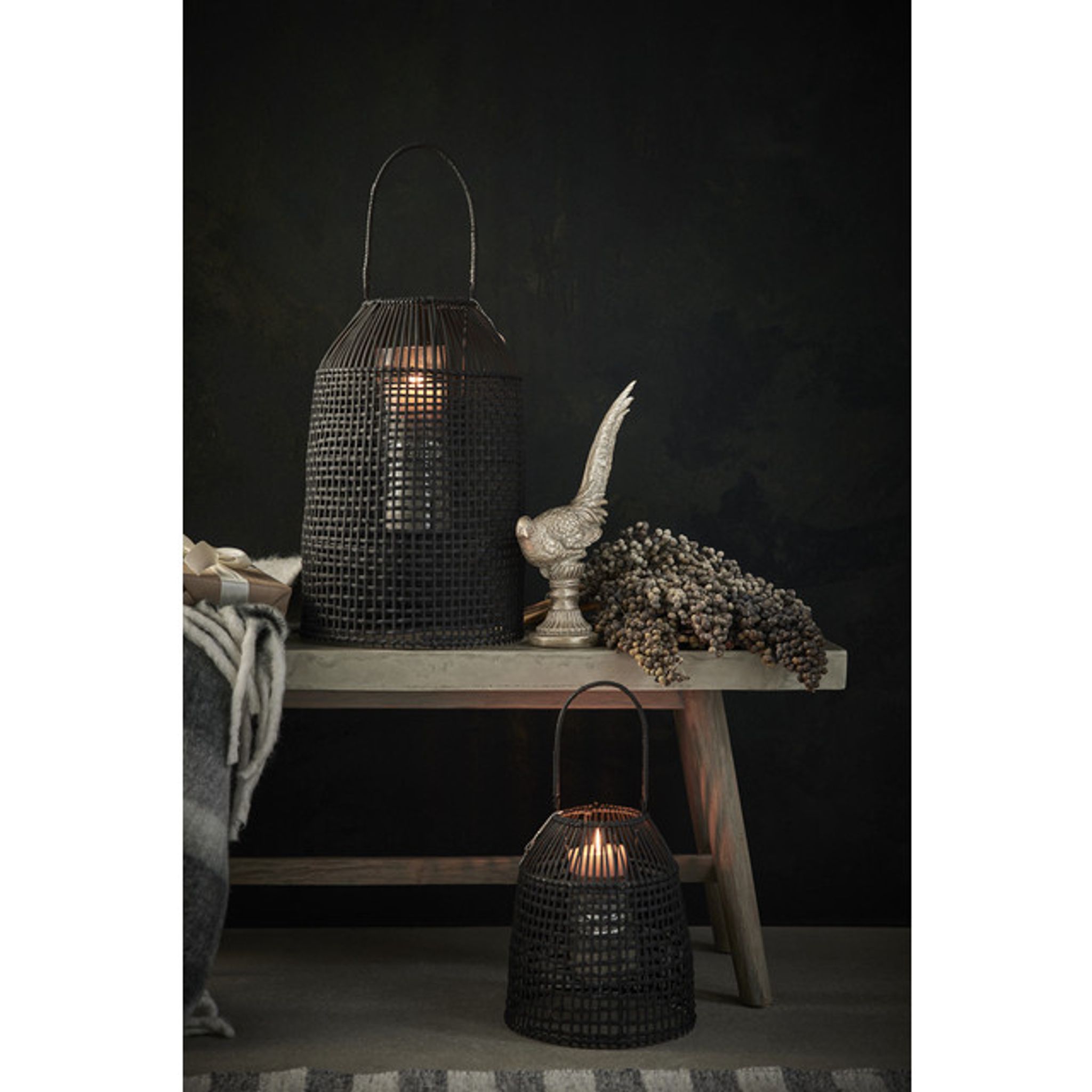 Den handvävda svarta rottinglyktan från Lene Bjerre är en dekorativ ljuslykta som passar i vardagsrum, på matbordet, hyllan eller uteplatsen. Den ger ett varmt, levande sken som höjer stämningen i dina kvällar och fungerar lika bra som dekoration även när den är släckt.