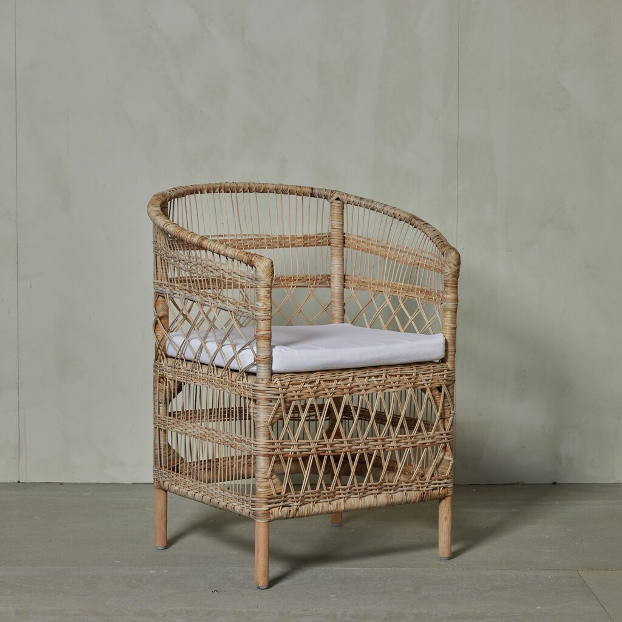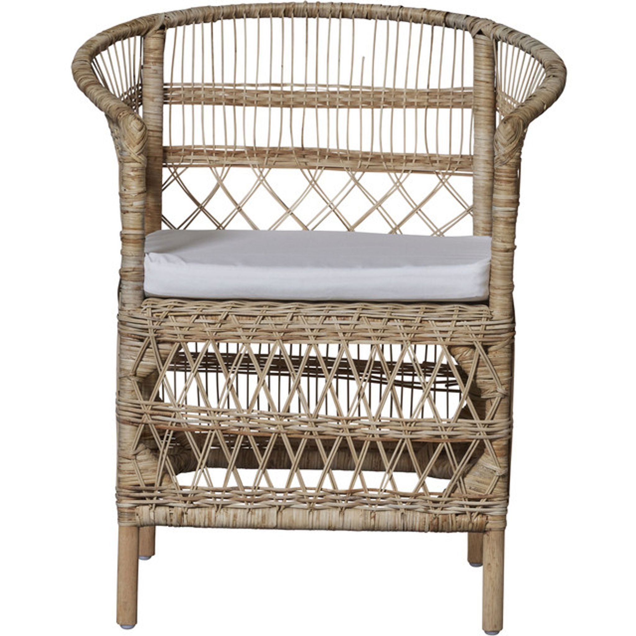 Material: rotting. Mått: B 69 x D 46 x H 83 cm. Vikt: 5 kg. Färgen är natur. Kuddar medföljer för bekvämare sittning. Underhållet är enkelt — torka av med en fuktig trasa och polera med en mjuk torr trasa.