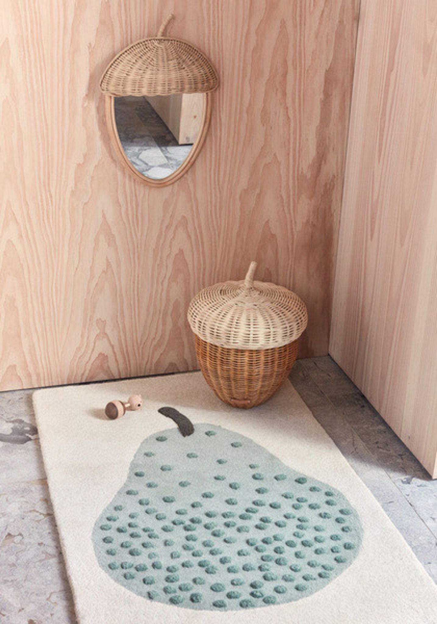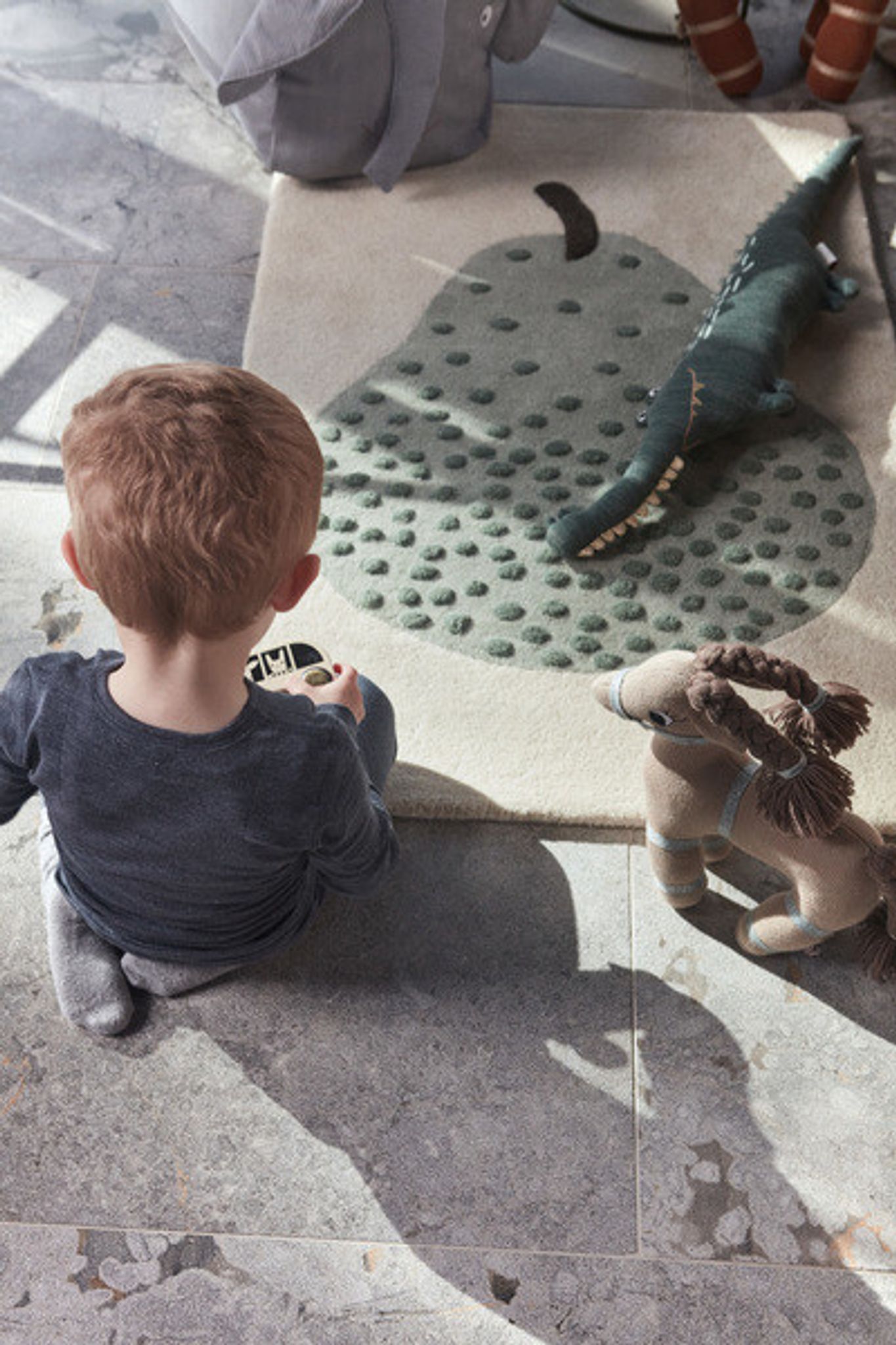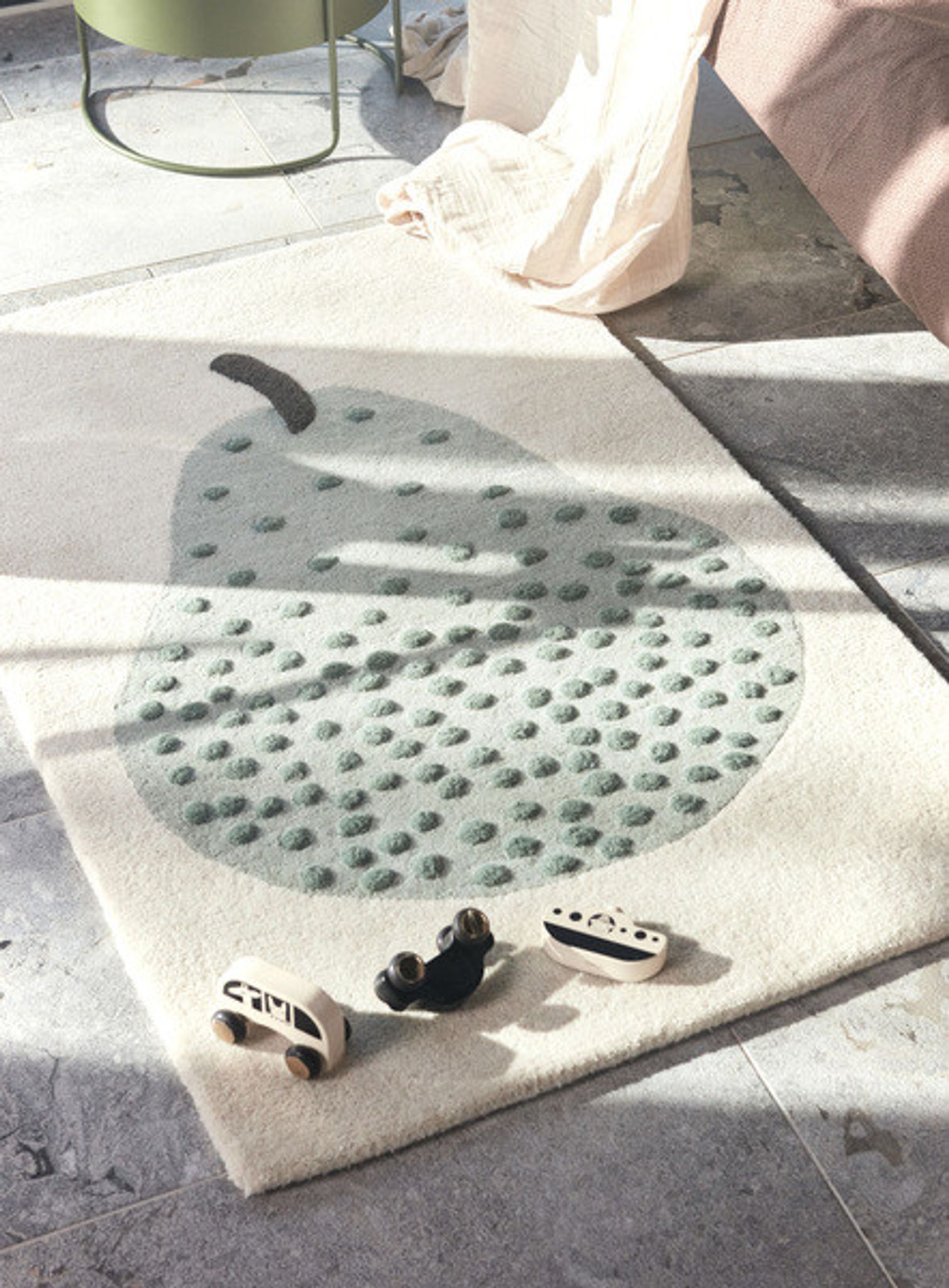 Den pärontuftade ull- och bomullsmattan kombinerar funktion och enkel estetik. Materialvalen ger en mjuk yta som bidrar till tryggare lekstunder och en ombonad känsla i rummet. Mattan smälter in i olika inredningar och gör det enklare för ditt barn att leka på golvet.