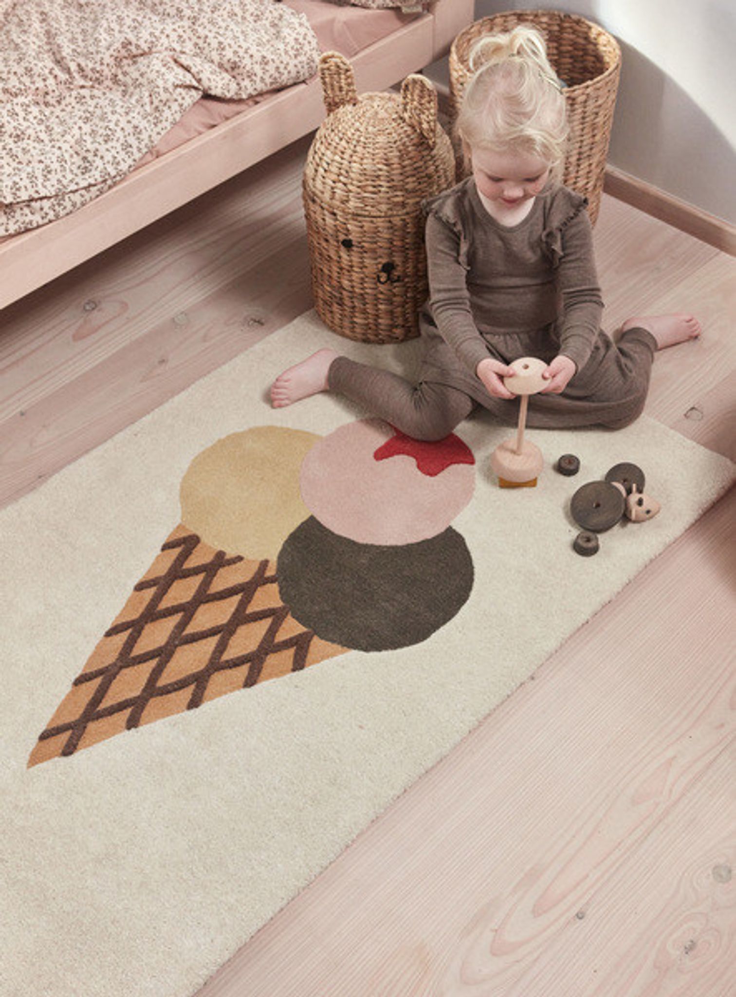 Mattan är tillverkad av 80% ull och 20% bomull vilket gör den mjuk att sitta och leka på. Med måtten 140 x 80 cm får ditt barn en rymlig yta att leka, läsa eller bygga med klossar på. Som barnmatta fungerar den lika bra i lekrum som i andra delar av hemmet.