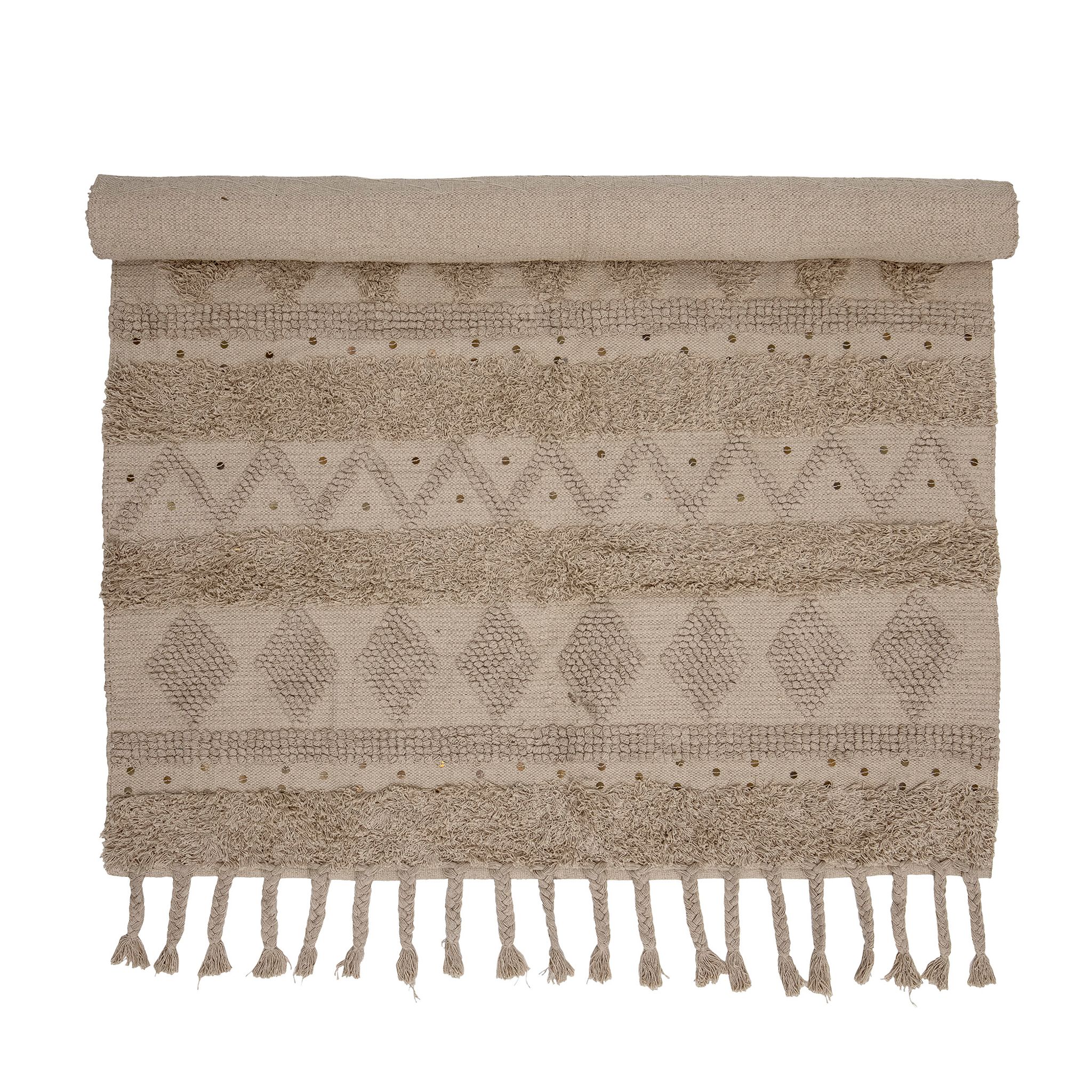 Dasha Matta Natur är en rektangulär bomullsmatta (140 x 200 cm, höjd 3 cm) som kombinerar praktisk användning med ett genomtänkt utseende. Handvävd teknik ger hållbarhet och tydlig karaktär, samtidigt som bomullen gör mattan behaglig att gå på. Paljetterna och fransarna ger ett subtilt dekorativt uttryck som lyfter din heminredning och skapar en inbjudande stämning.