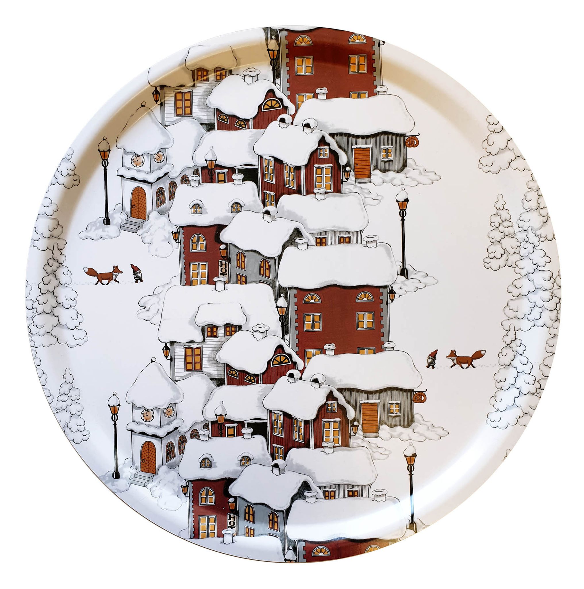Upptäck Mikkel rund bricka från Arvidssons Textil, designad av MiaLotta Arvidsson-Mars. Denna unika bricka är inspirerad av nostalgiska byar från tidigt 1900-tal och pryds av ett charmigt vintrigt mönster med en liten tomte och hans rävkompis.