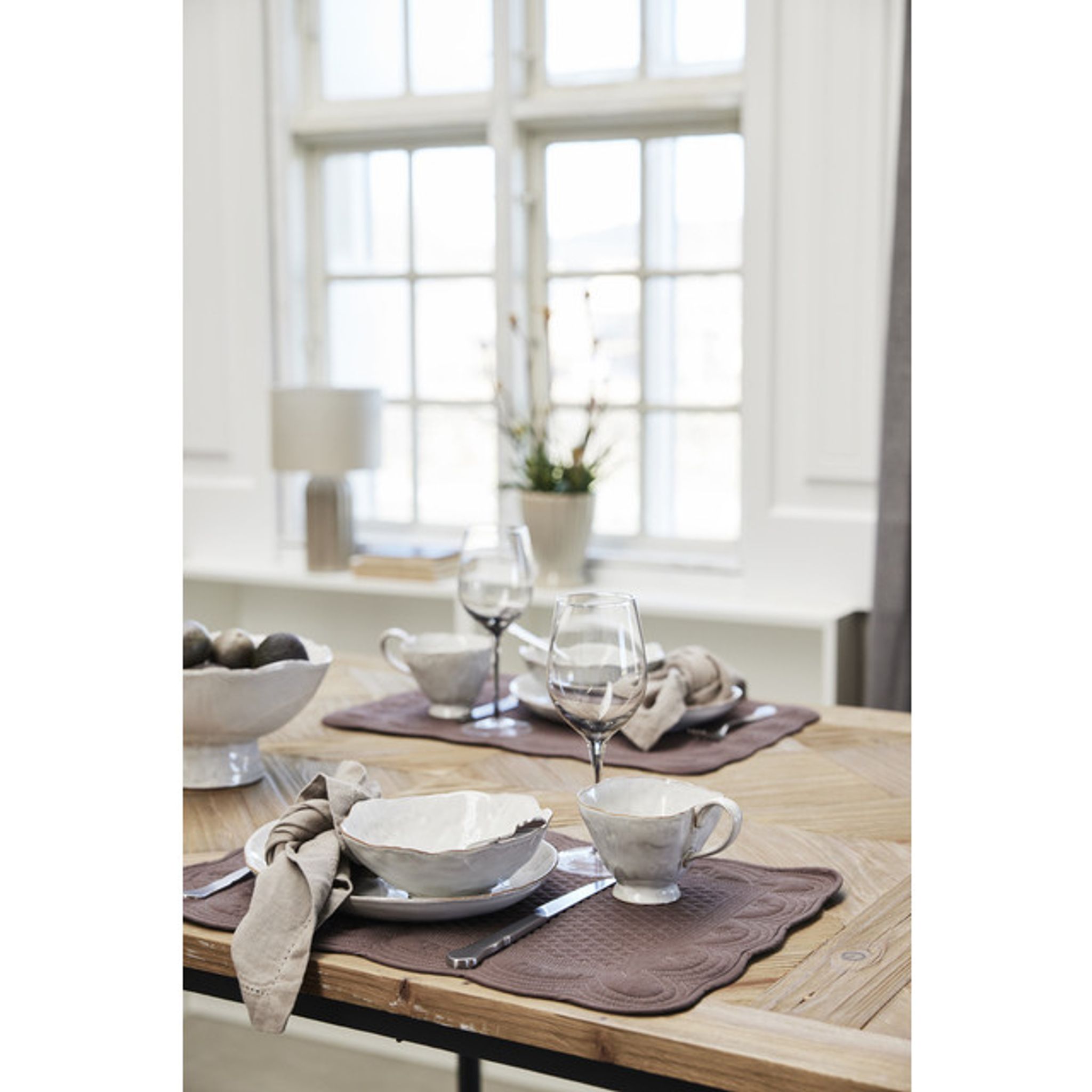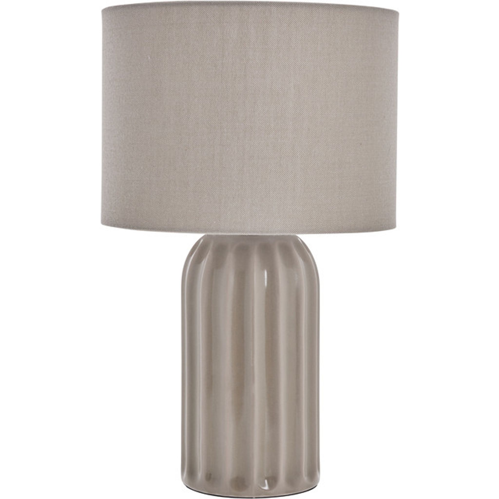 Denna bordslampa från Lene Bjerre (Nemia) är en glasyrad keramiklampa med vertikala räfflor och en tygskärm i ljus naturton. Den ger ett mjukt, varmt ljus och passar som sängbordslampa, läslampa vid skrivbordet eller som extra belysning i vardagsrummet för att skapa en lugnare stämning.