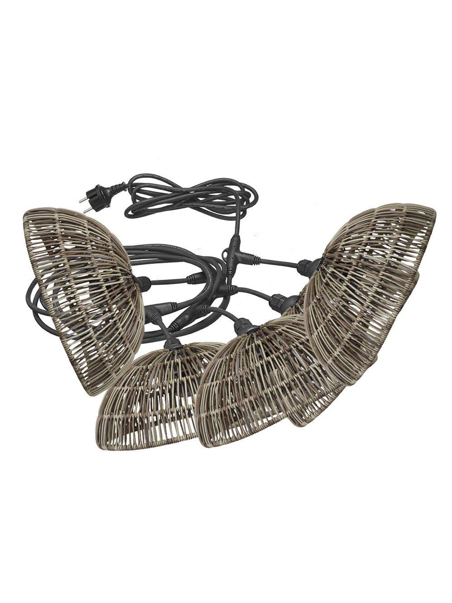 Flex Out ljusslinga är en robust ljusslinga utomhus med fem E27-lamphållare och grå konstrottingkärmar. Den 6,5 m långa slingan passar uteplatsen, trädgården eller balkongen och ger en varm och inbjudande stämning som förbättrar din utomhusbelysning.
