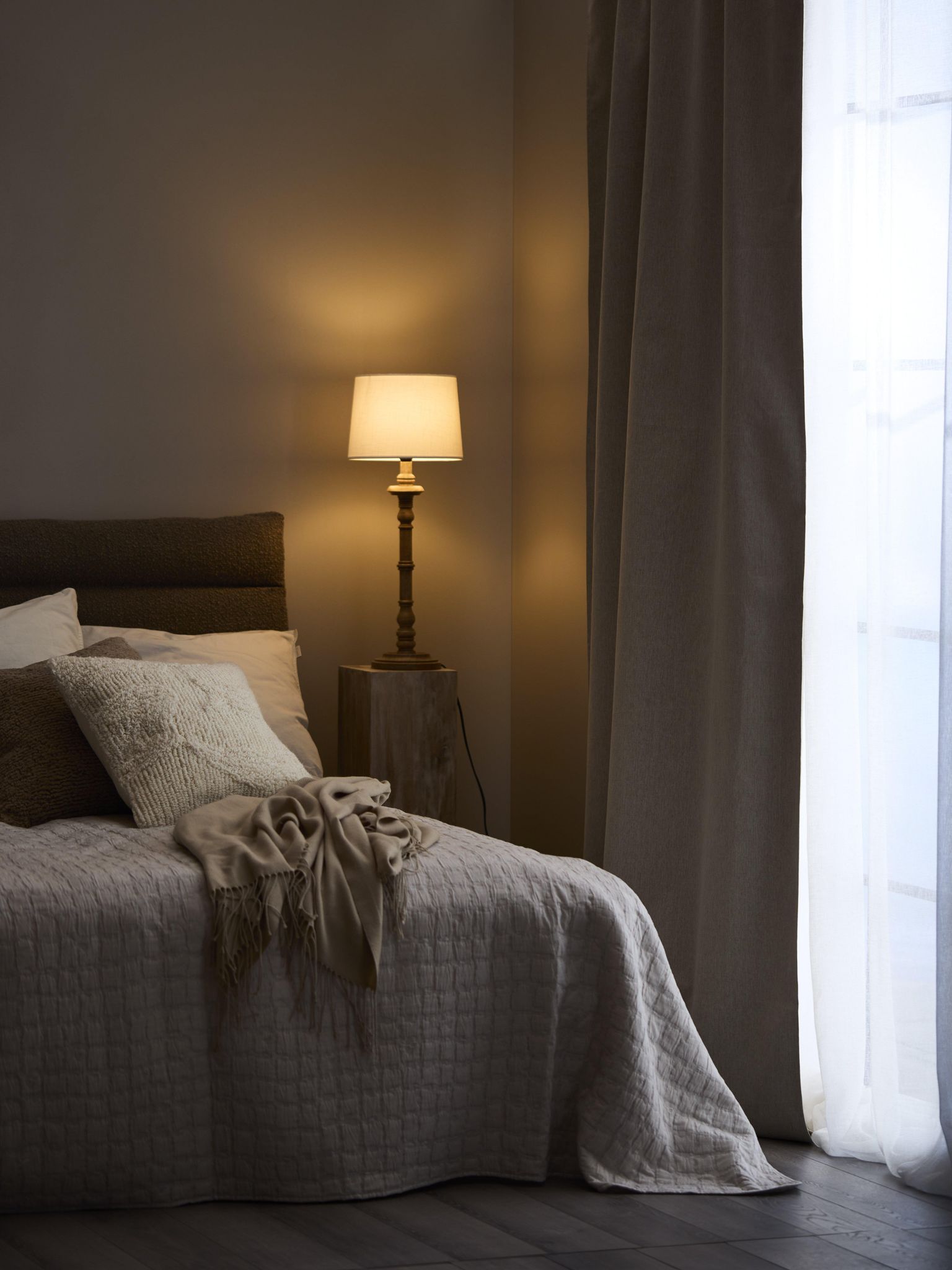 Montera din favorit lampskärm och sätt i en kompatibel lampa. Lampfoten är avsedd för torra inomhusmiljöer. Kabeln ger flexibilitet i placering och strömbrytaren gör det enkelt att slå av och på lampan utan att resa dig.
