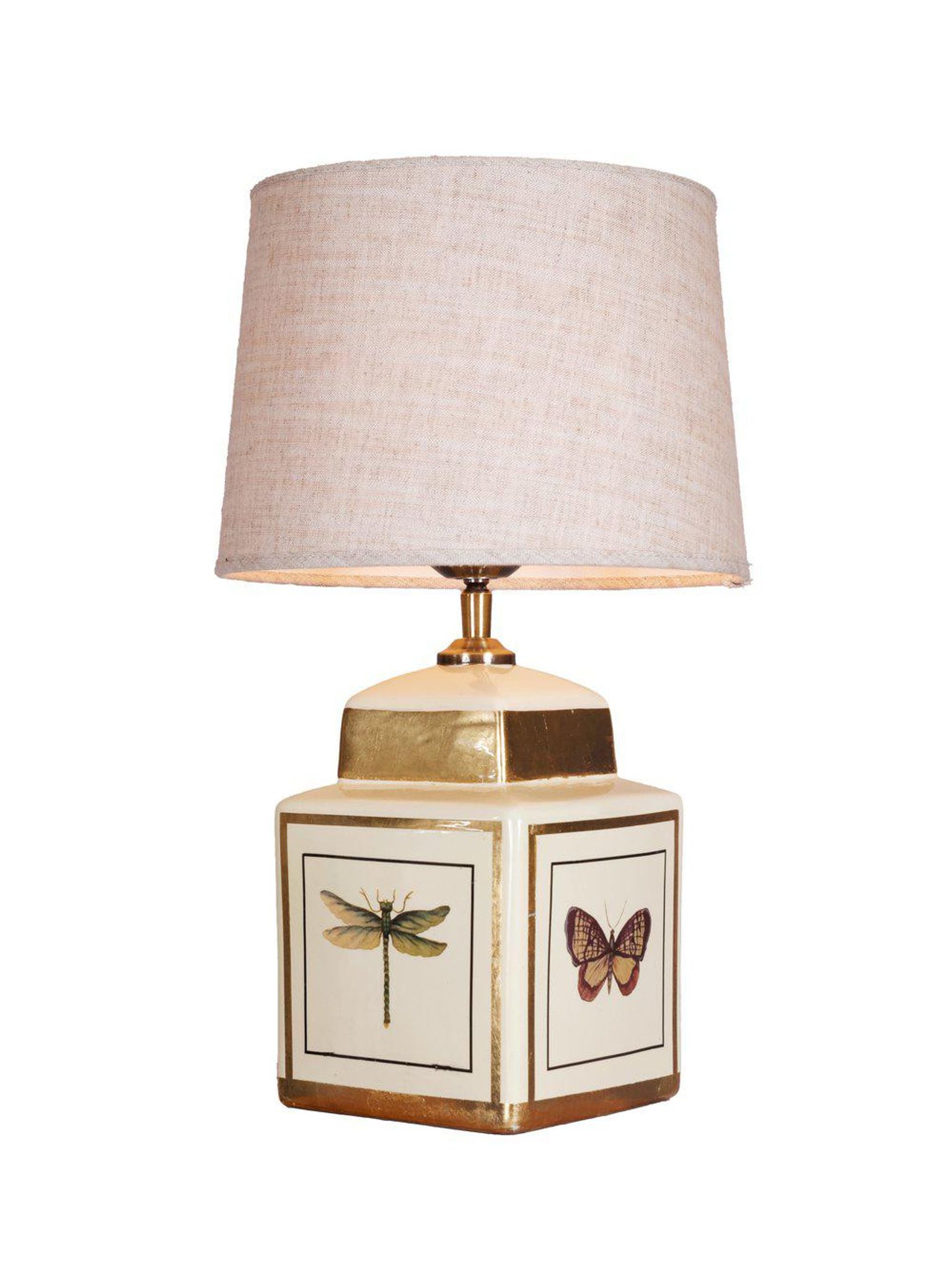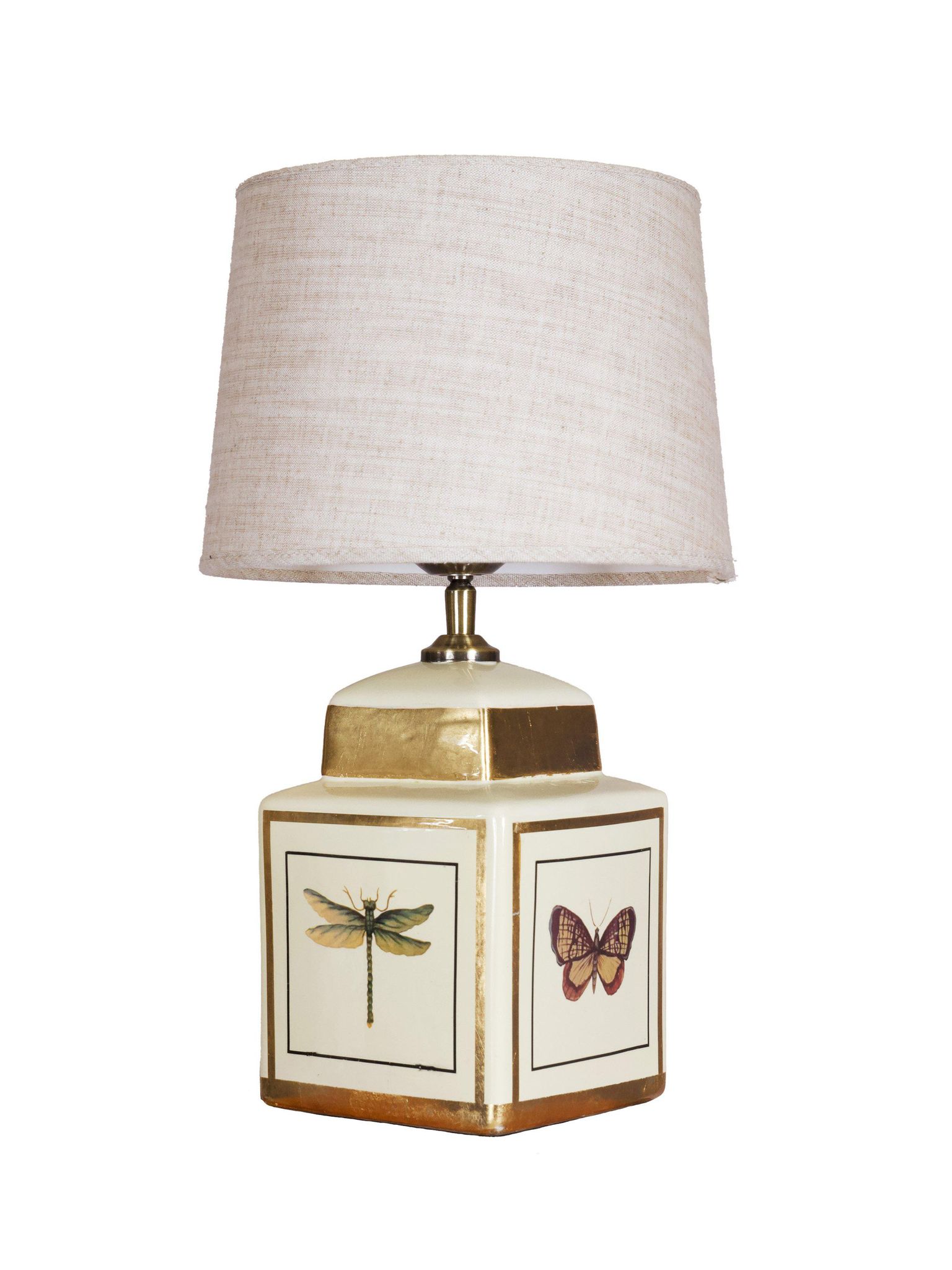 - Material: Keramisk fot med handmålad dekor av fjärilar i pastellfärger och skimrande gulddetaljer.