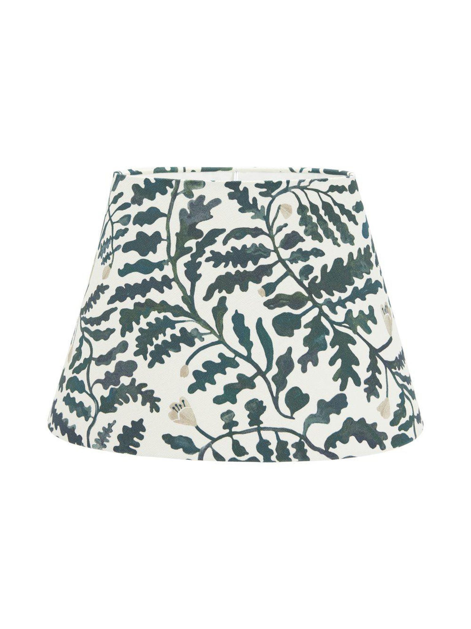 Oval Green Cotton Lampshade Bertie är en grön lampskärm i bomull med ett modernt lövmönster. Den passar i vardagsrum eller sovrum och ger ett varmt, inbjudande ljus som förhöjer din inredning och belysning.