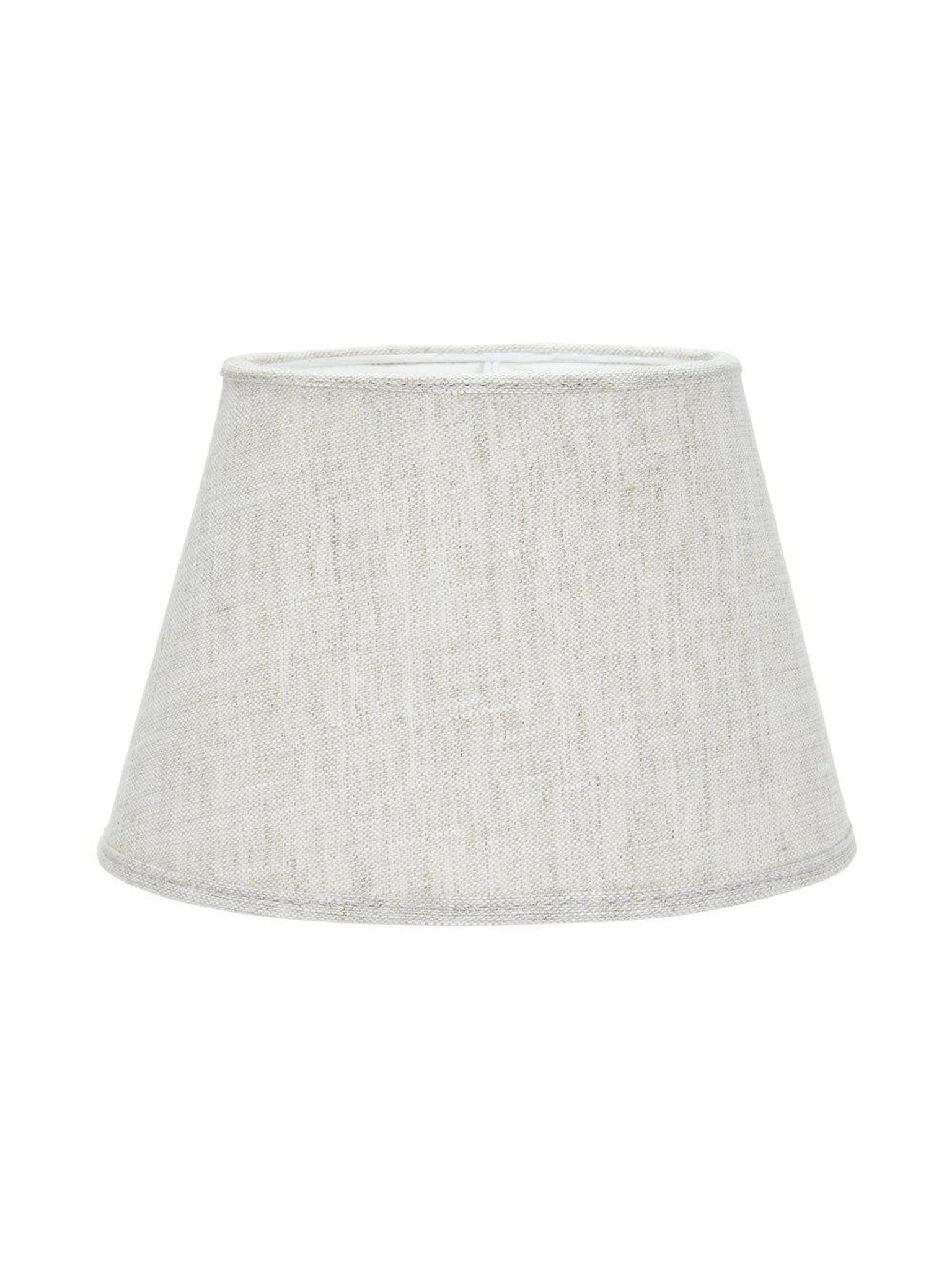 Oval lampskärm 43 x 27 cm i 100% lin, beige med lin/vit finish. Den passar inomhus och funkar på din lampa, är praktisk, snygg, håller länge och är bra.