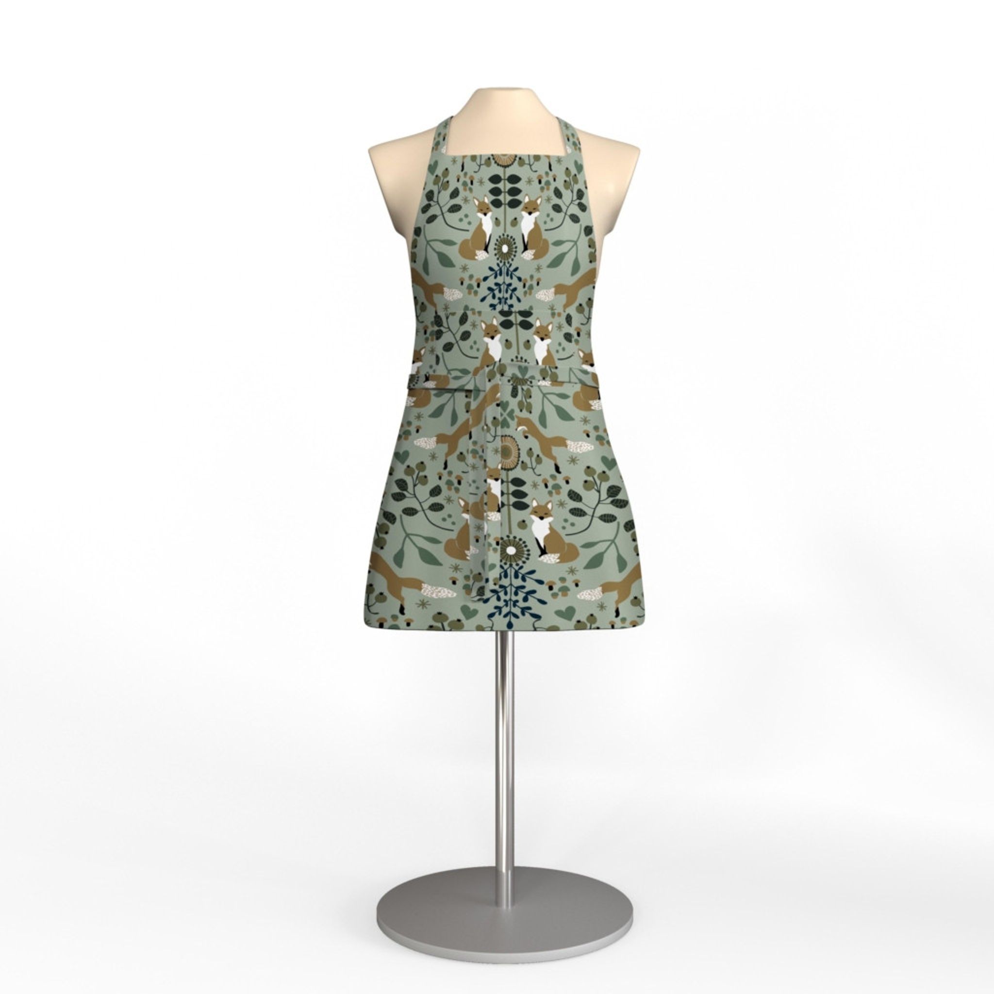 Rävstigen grön förkläde med ficka från Arvidssons Textil kombinerar lekfullt mönster med praktisk funktion. Tillverkat i bomull för komfort i köket, verkstan eller trädgården. Designad av Linda Svensson Edevint.