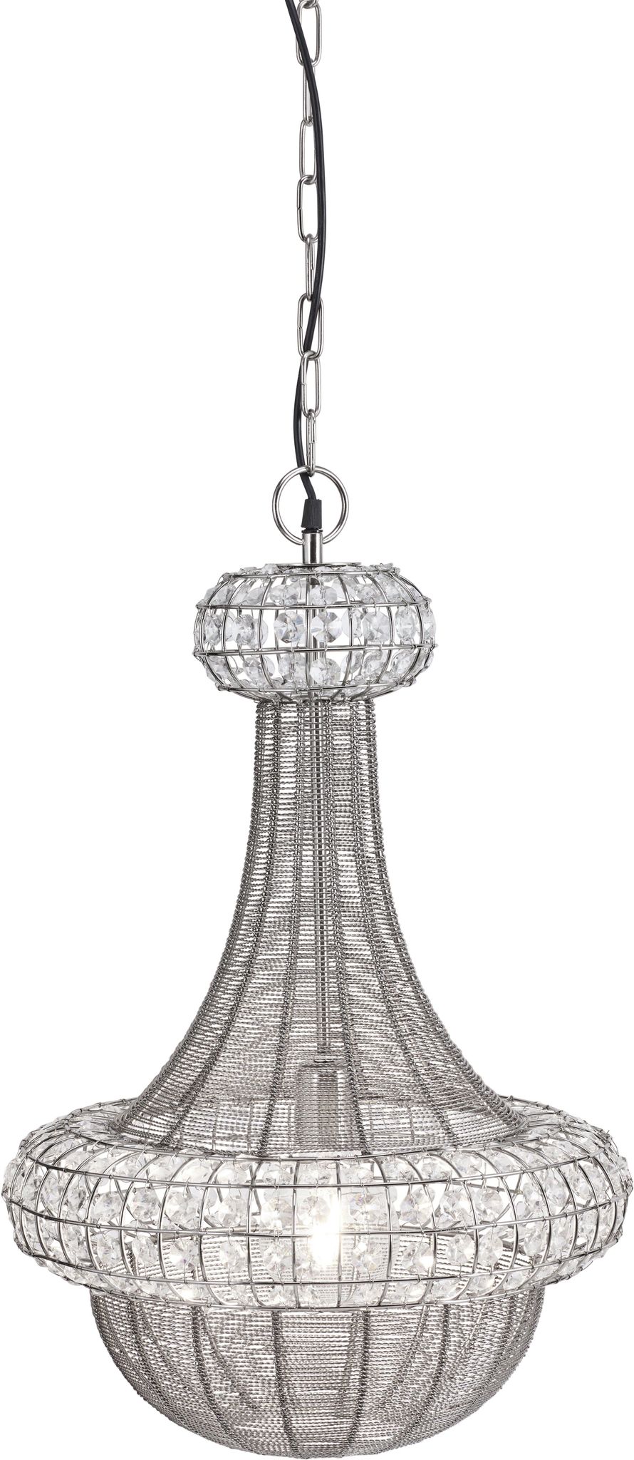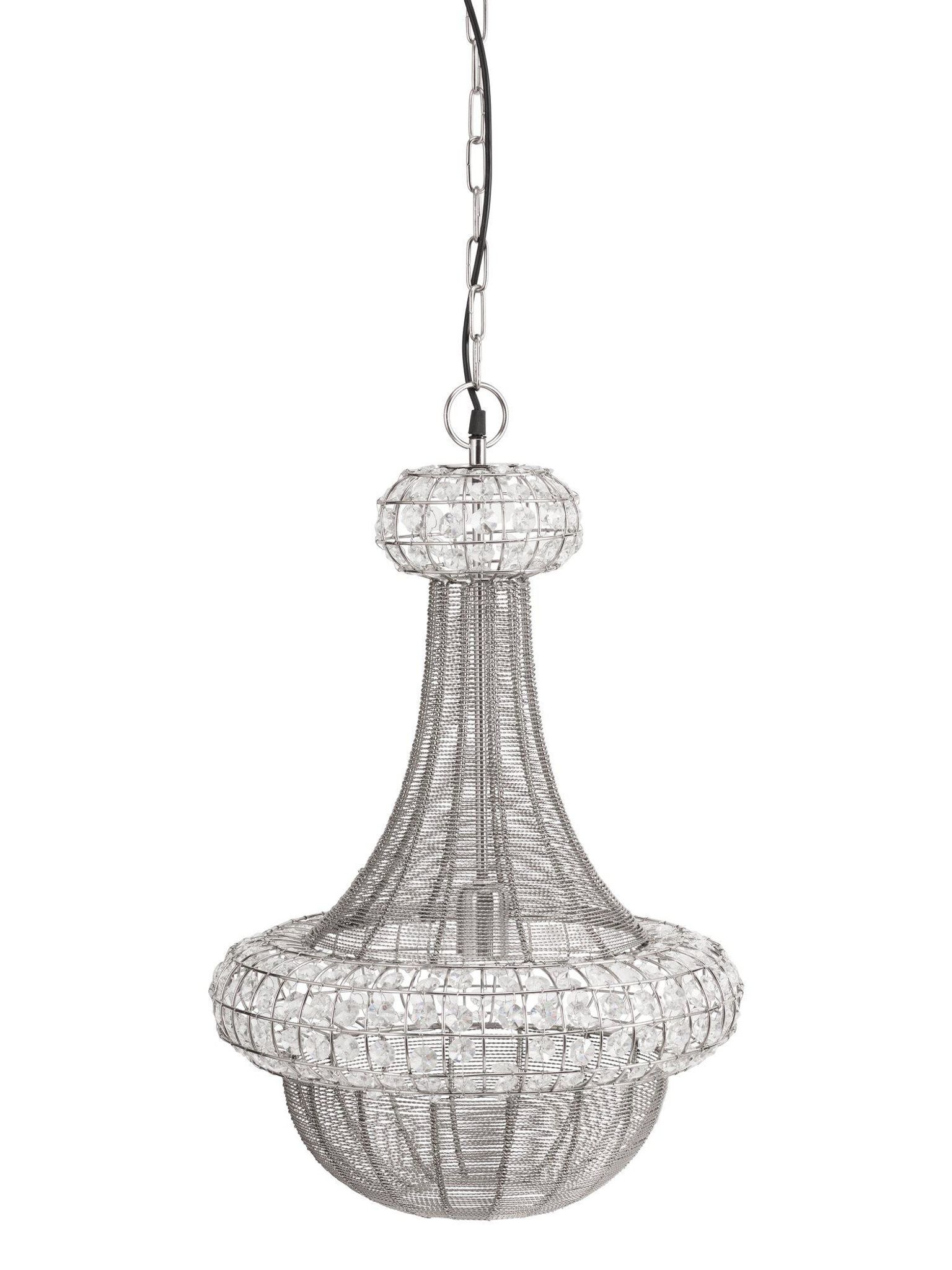 Upptäck den eleganta PR Home Saba taklampan i silver, en modern tolkning av den klassiska takkronan. Med en diameter på 42 cm och en höjd av 66 cm, blir denna lampa en iögonfallande detalj i ditt hem.