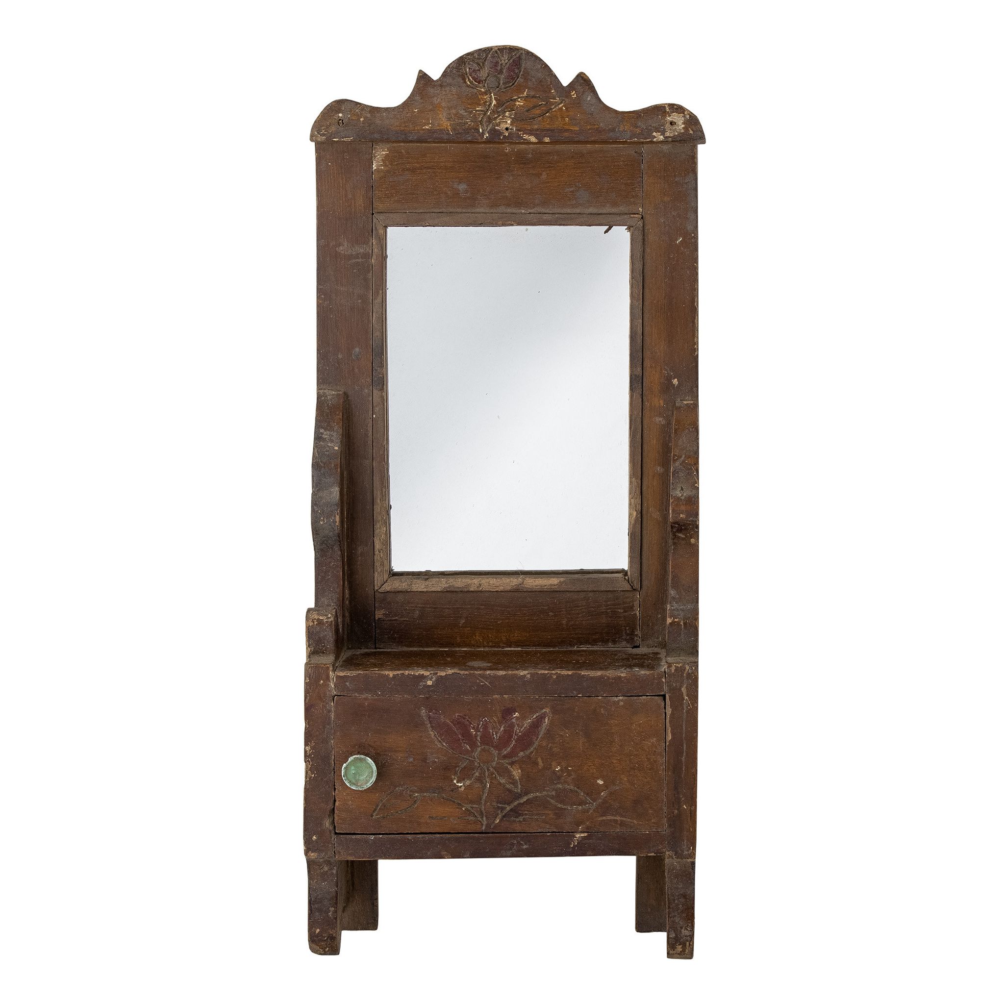 Materialet och den handgjorda känslan innebär att varje exemplar skiljer sig något åt. Dimensionen är H43cm, vilket gör den lättplacerad på många ställen. Hyllan och lådan gör spegeln särskilt användbar i hallen eller sovrummet.