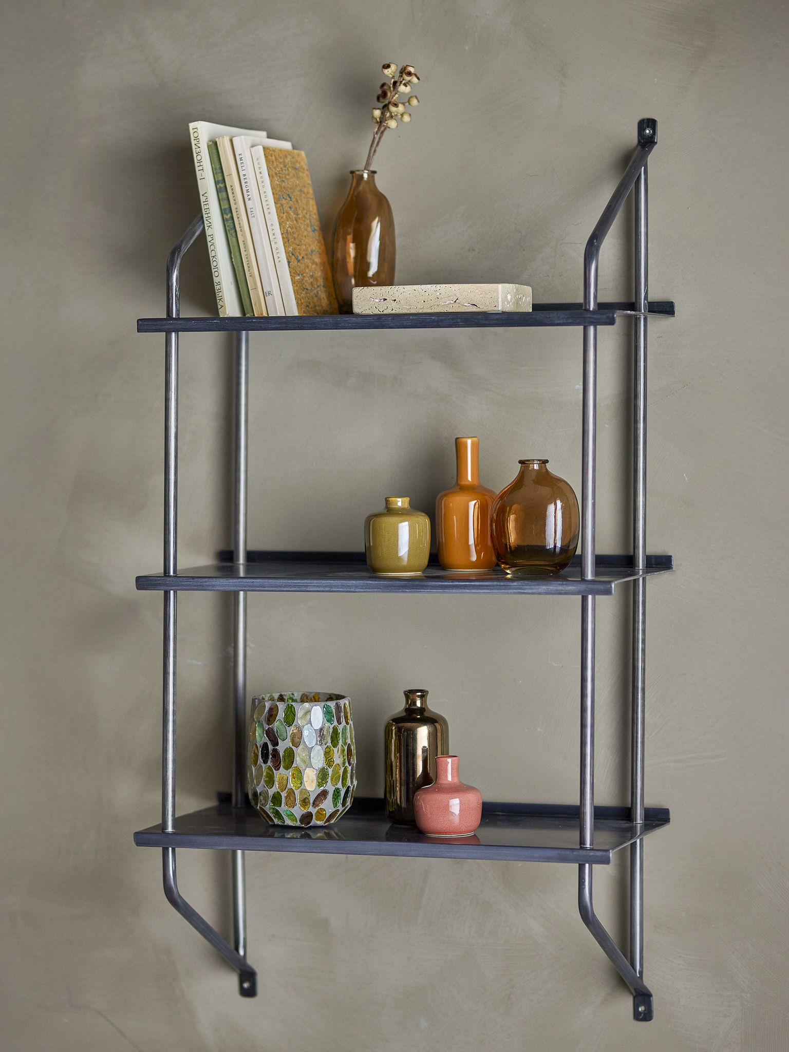 Hyllan förenar design och funktion: du får en plats för böcker, växter eller kökskryddor samtidigt som den bidrar till en rå, kontrollerad stil i rummet. Den svartlackerade ytan ger ett enhetligt uttryck och gör att dina föremål syns tydligt.