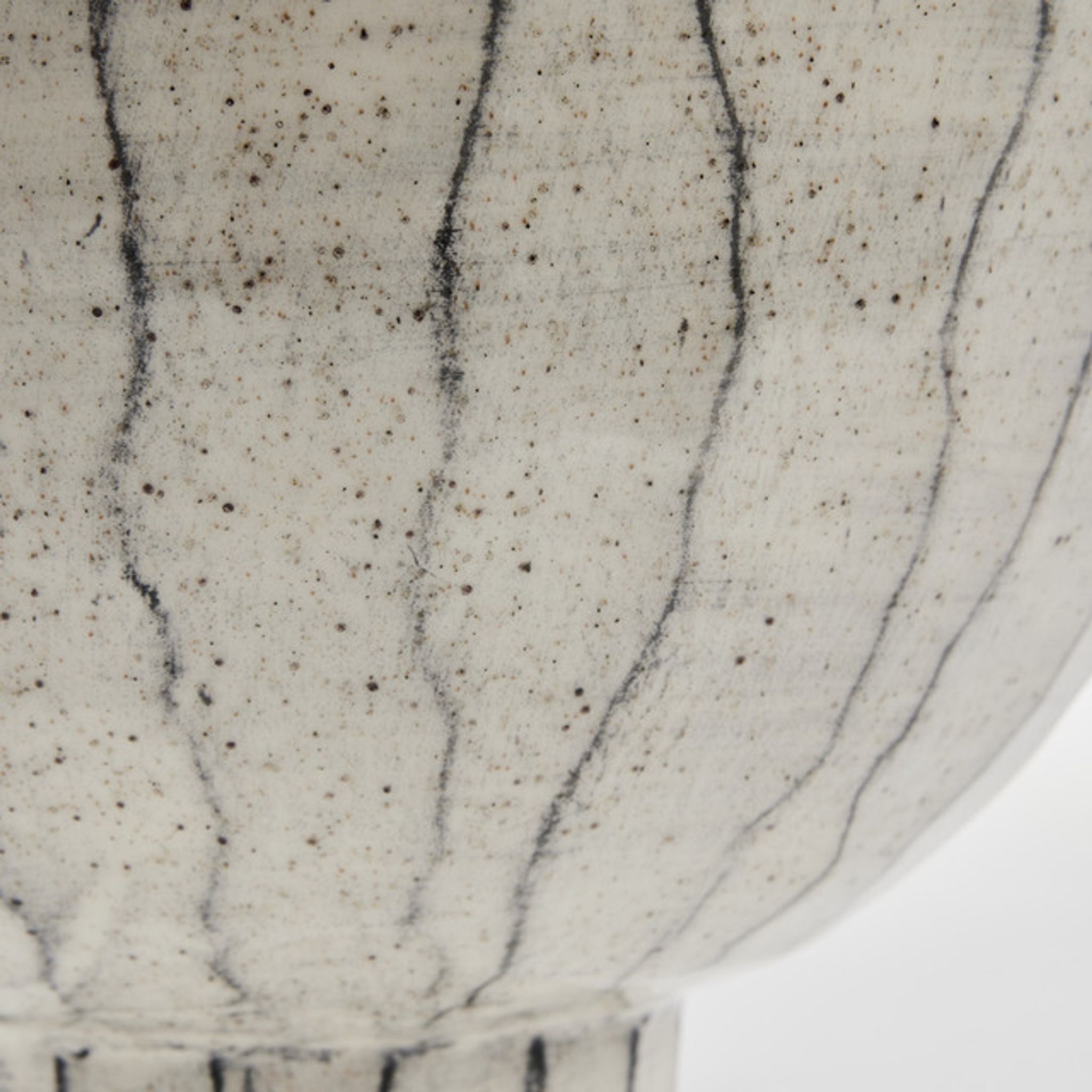 Skålen är tillverkad i keramik och har måtten 28x28x33 cm. Den har handgjorda ränder och ytskikt som gör varje exemplar unikt, och konstruktionen är gjord för att hålla länge. Torka av med en fuktig, mjuk trasa för enklast skötsel. Materialet är livsmedelssäkert så du kan använda skålen till frukt och lättare servering.