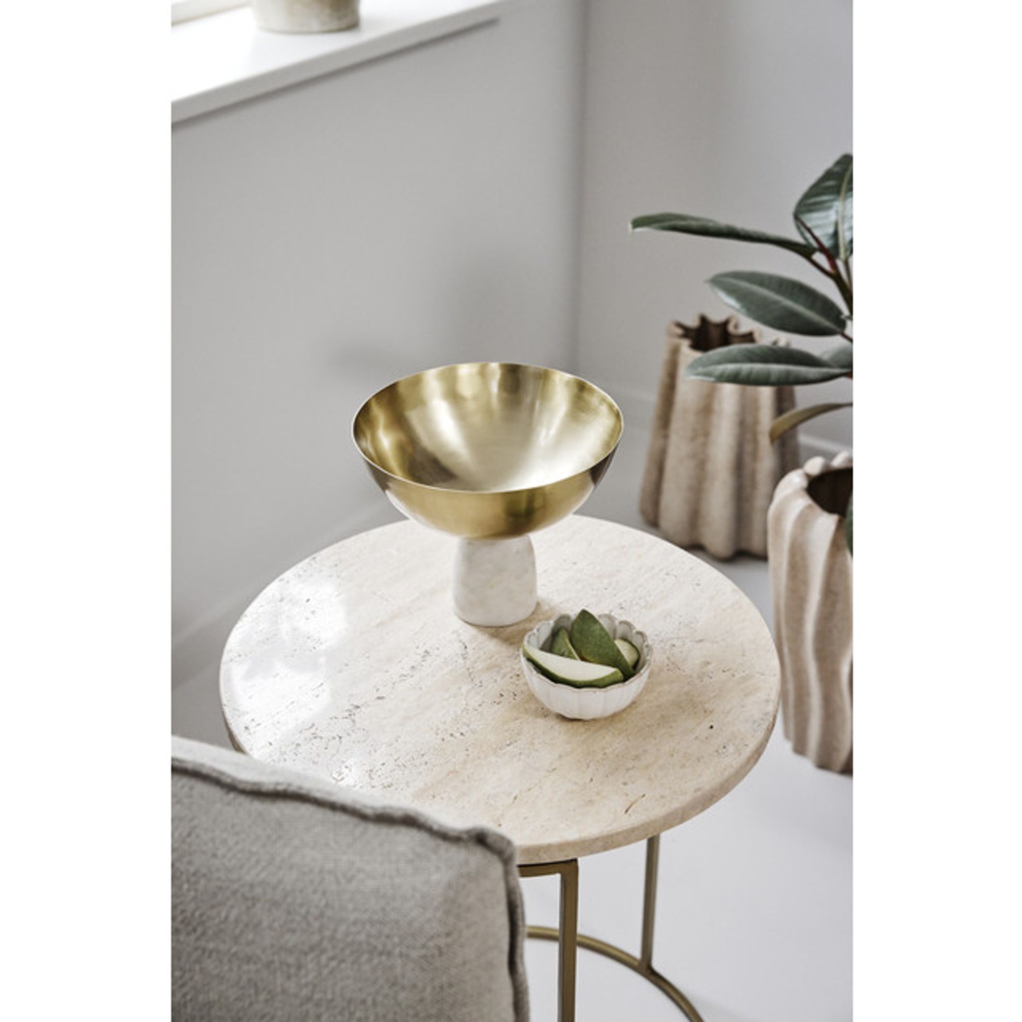 Skålen är tillverkad i rostfritt stål med en stabil marmorbas, vilket ger både tyngd och hållbarhet. Mått: 19 x 19 x 15,5 cm. Färg: ljusguld. Märke: Lene Bjerre, serie Ellivia. Vikten är cirka 0,95 kg. Genom att samla småsaker ger skålen dig bättre ordning och en mer omhändertagen yta — konkret hjälp i vardagen.