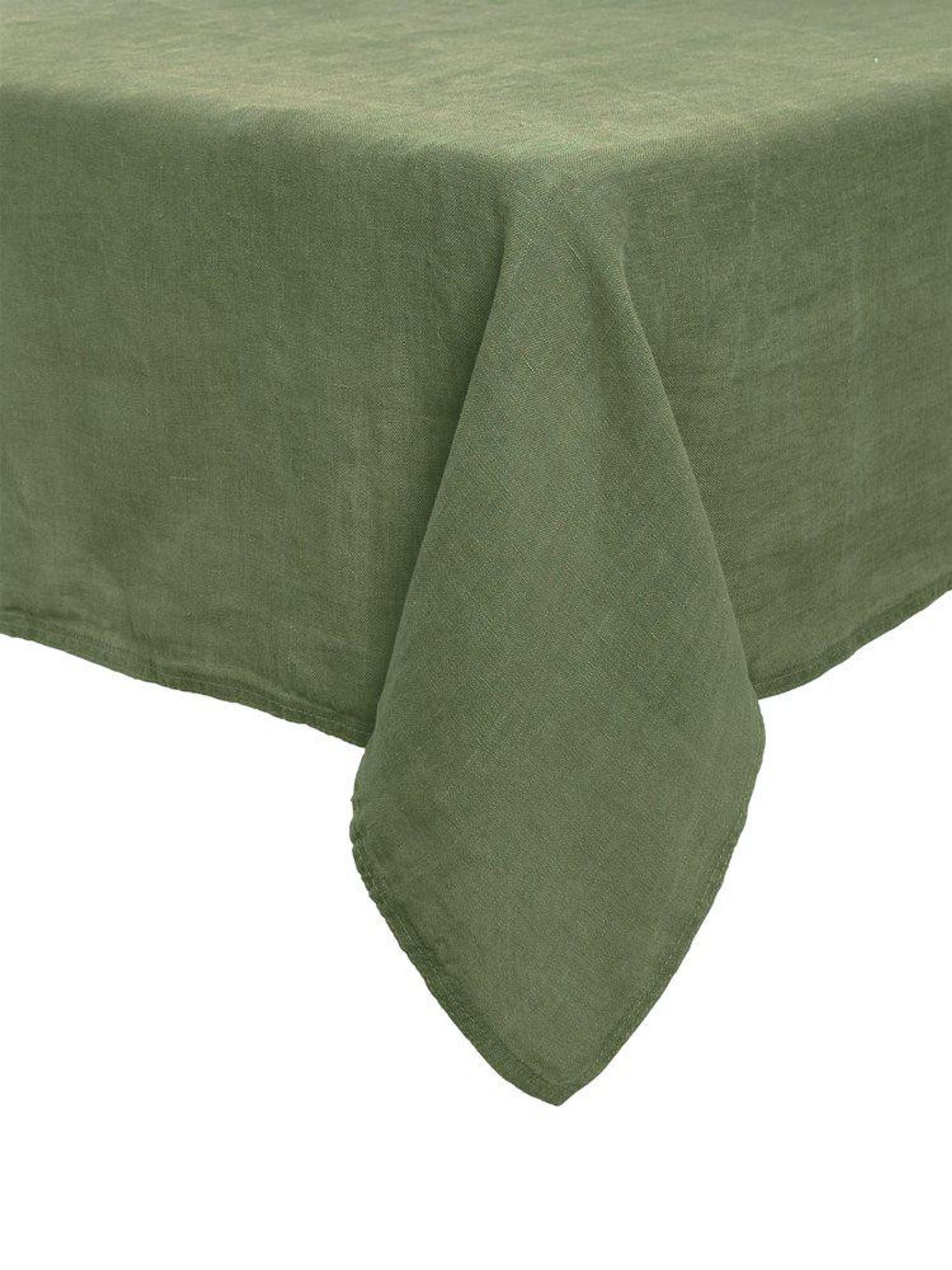 Grön tumlad linnebordsduk 145x280 cm, Julie-serien från Svanefors, 40x34 trådantal och certifierad enligt STANDARD 100 by OEKO-TEX®. Passar ditt matbord, håller länge, är snygg, praktisk och bra och funkar när du dukar.