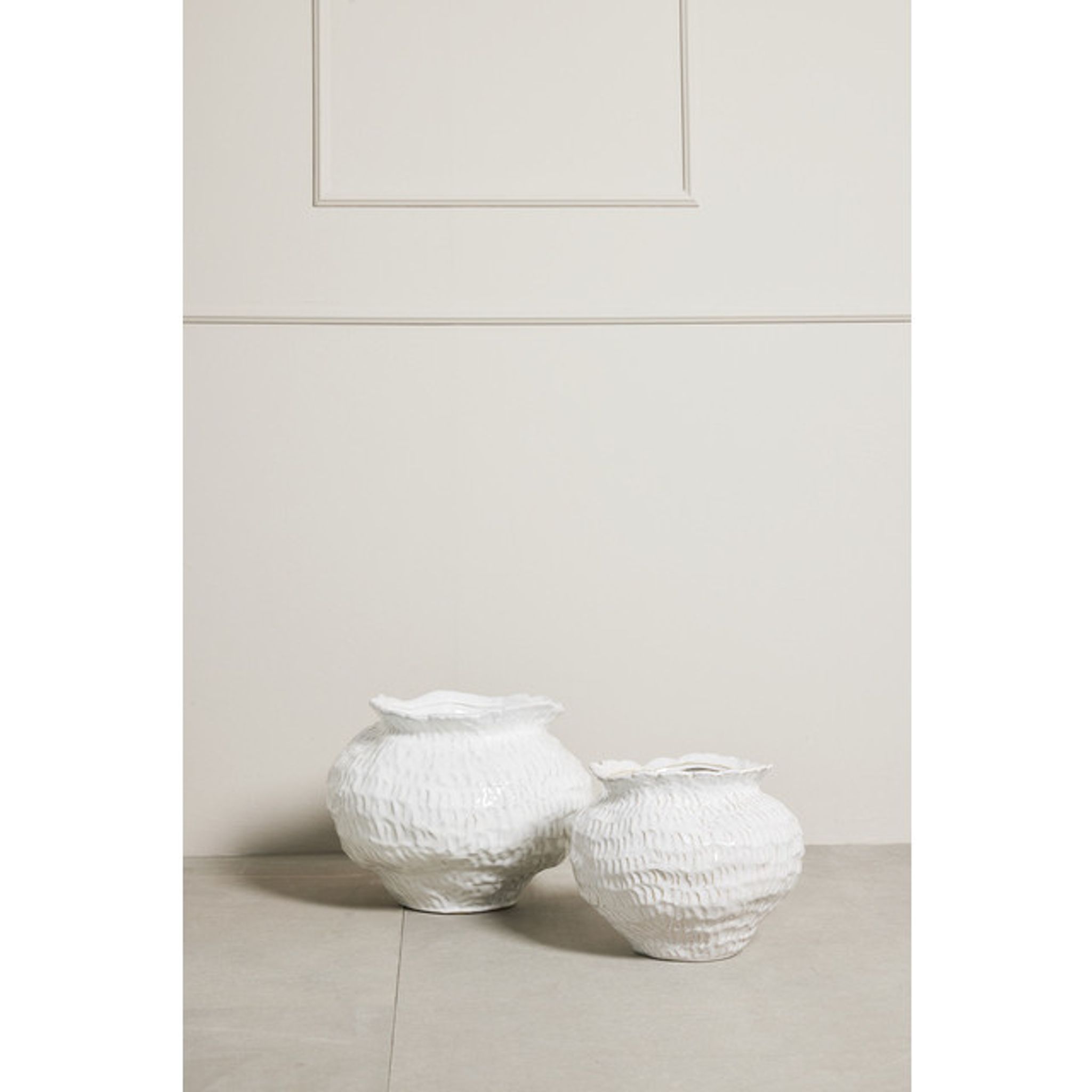 Marlia handgjord keramikvas från Lene Bjerre är en vit dekorationsvas som fungerar som mittpunkt på ditt matbord, en hylla eller i hallen. Den gör sig lika bra fylld med blommor som ensam som ett uttryck i rummet — en enkel och stilren vas, handgjord och unik.