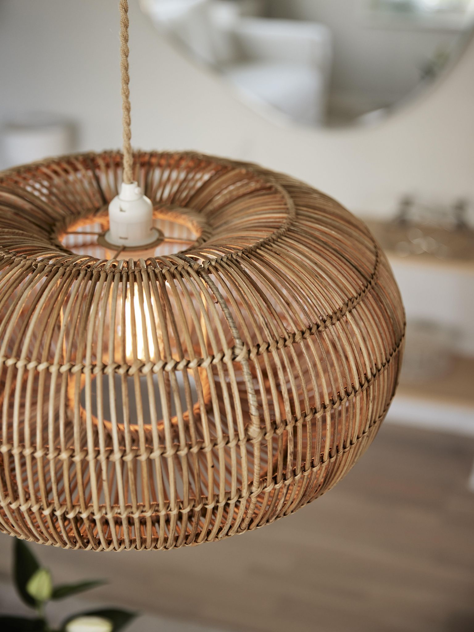 - Handflätad skärm av naturmaterial, vilket gör varje lampa unik.